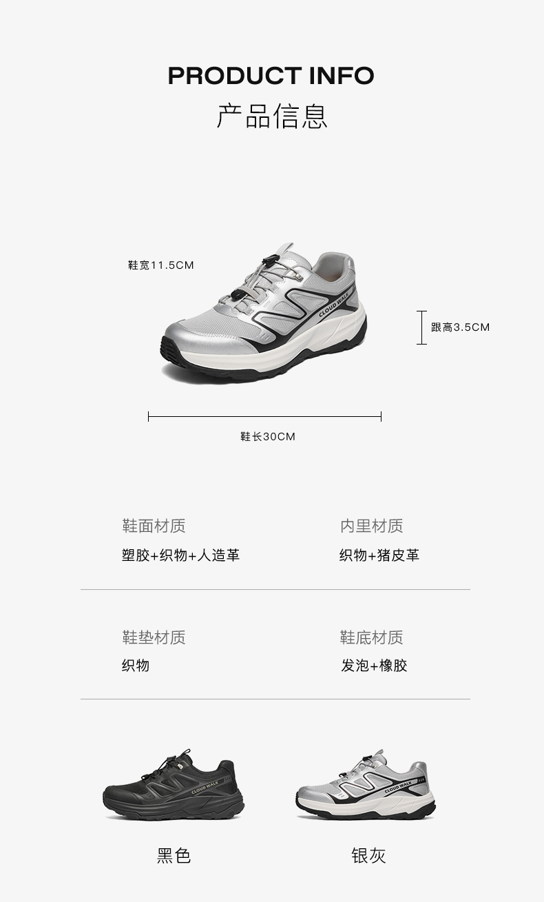 | 风格:休闲 | 色系:灰色 | 跟高数值:3.5CM | 40码鞋宽参考(男):11.5CM | 性别:男子 |