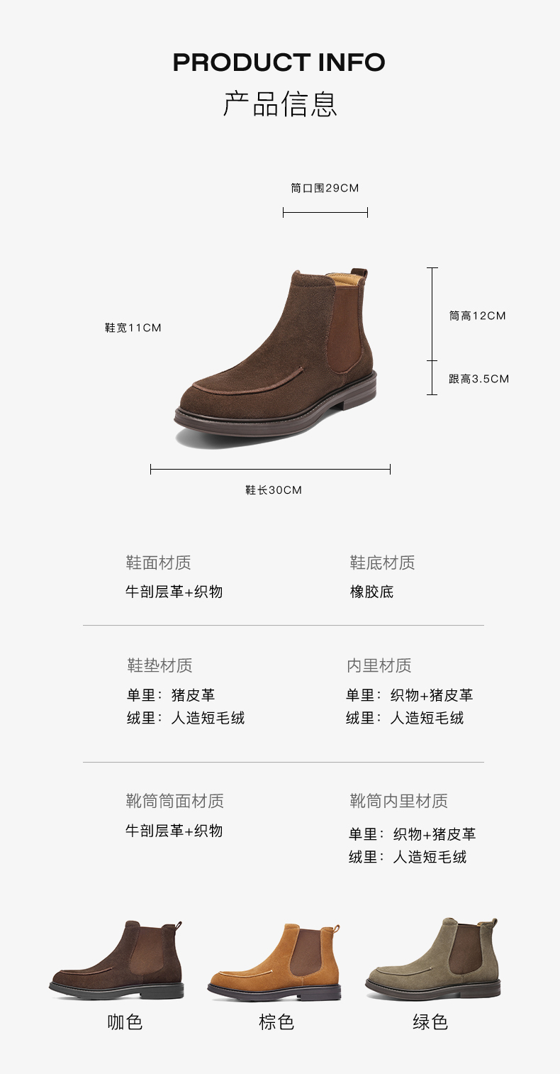 | 风格:休闲 | 色系:棕色 | 跟高数值:3.5CM | 40码鞋宽参考(男):11CM | 筒高数值:12CM |