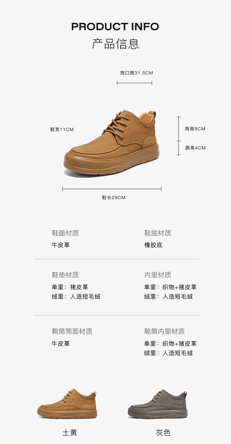 | 性别:男子 | 靴筒口围:31.5CM | 靴筒筒面材质:牛皮革 | 里料材质:人造短毛绒 | 上市时间:2025年冬季 |