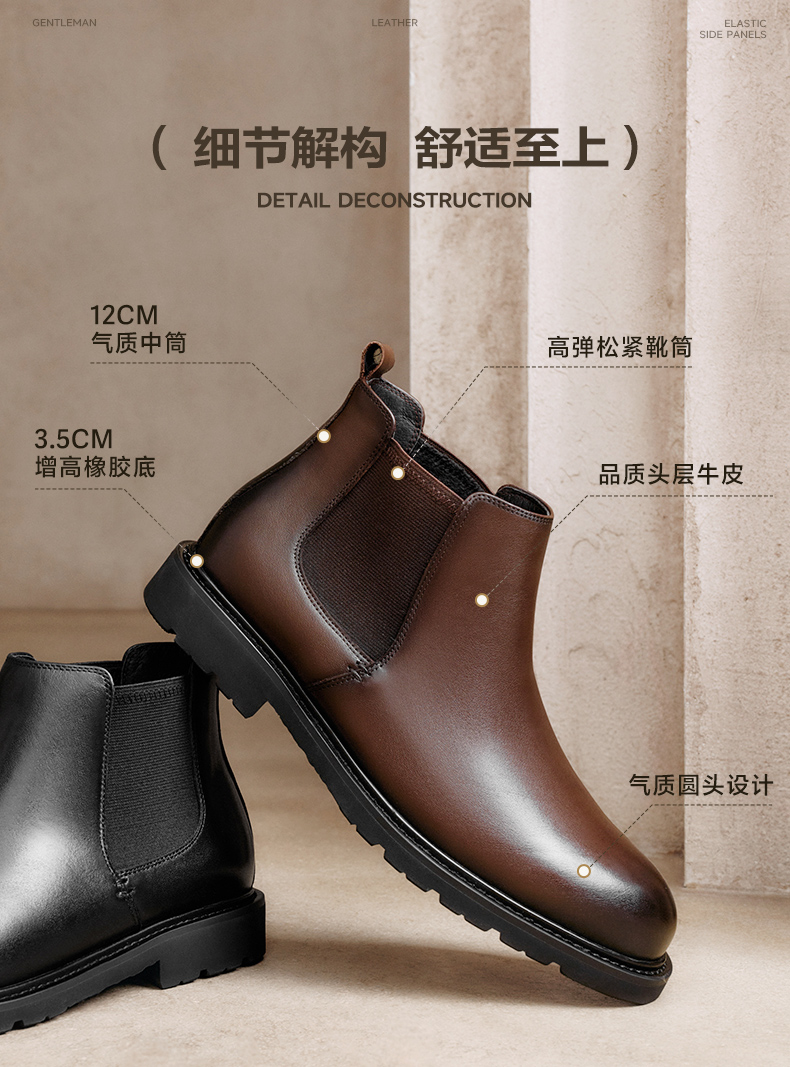 | 风格:休闲 | 色系:棕色 | 跟高数值:3.5CM | 40码鞋宽参考(男):11.5CM | 筒高数值:12CM |