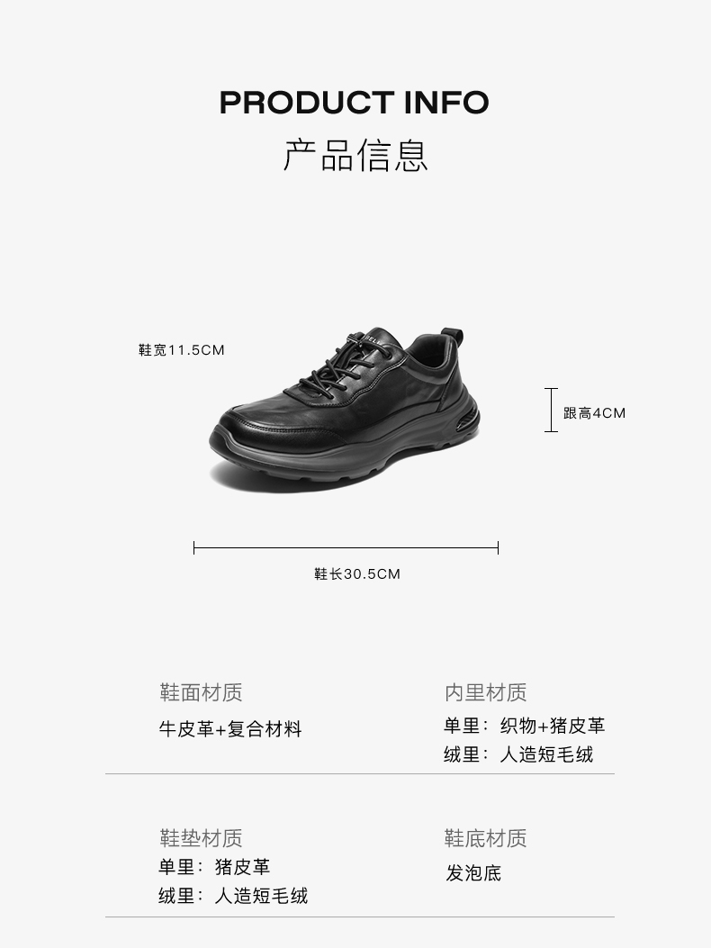 | 风格:休闲 | 色系:黑色 | 跟高数值:4CM | 40码鞋宽参考(男):11.5CM | 性别:男子 |