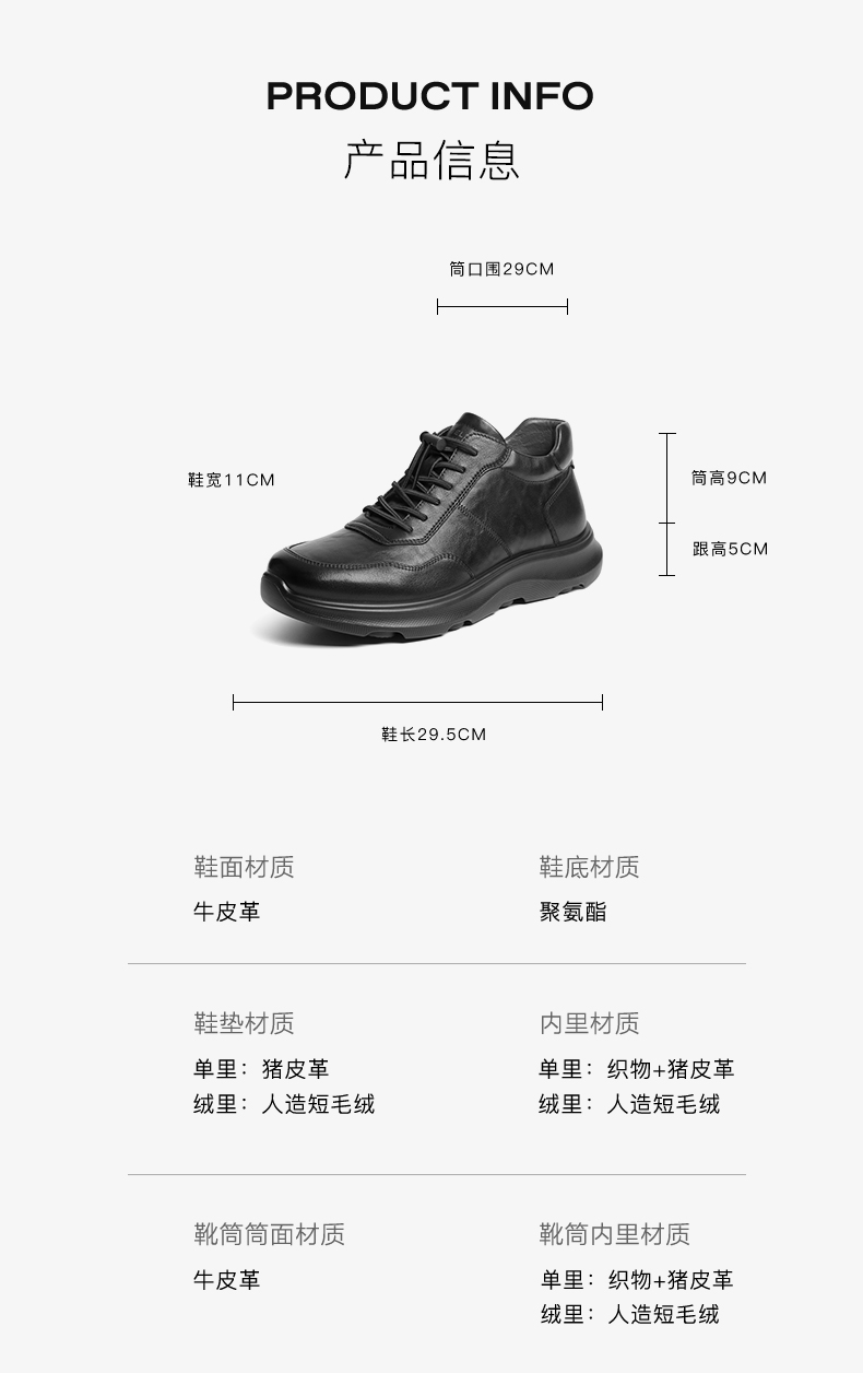 | 风格:休闲 | 色系:黑色 | 跟高数值:5CM | 40码鞋宽参考(男):11CM | 筒高数值:9CM |