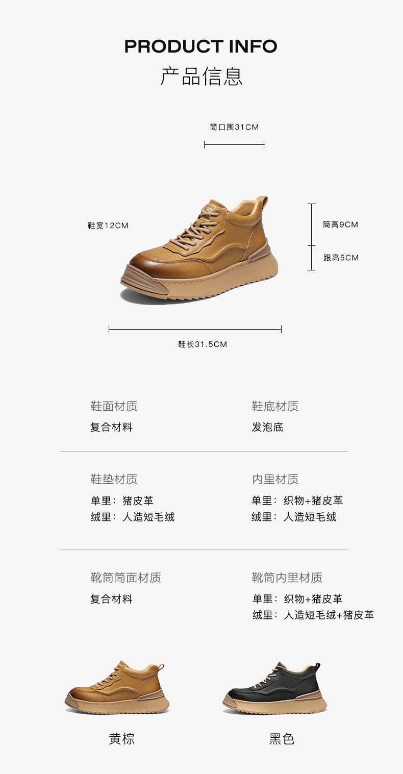 | 风格:休闲 | 色系:黄色 | 跟高数值:5CM | 40码鞋宽参考(男):12CM | 筒高数值:9CM |