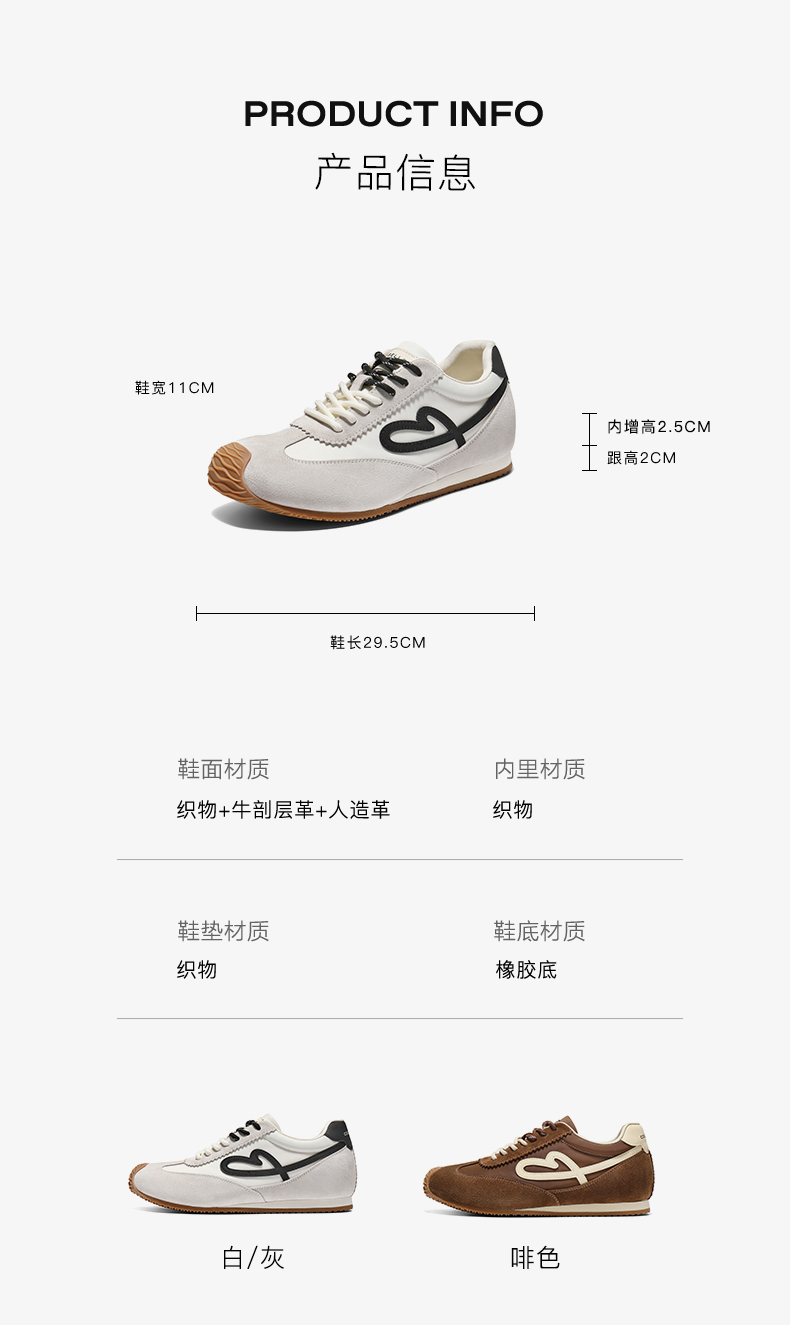 | 内增高:2.5CM | 鞋跟形状:平跟 | 鞋面材质:织物人造革牛剖层革 | 流行元素:撞色 | 闭合方式:系带 |