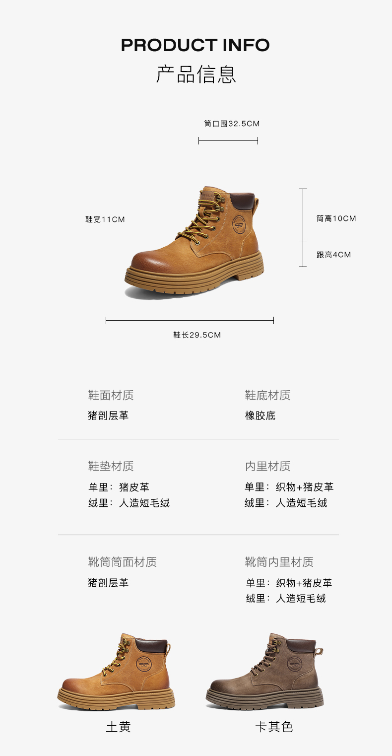 | 风格:休闲 | 色系:卡其 | 跟高数值:4.5CM | 40码鞋宽参考(男):10CM | 筒高数值:11CM |