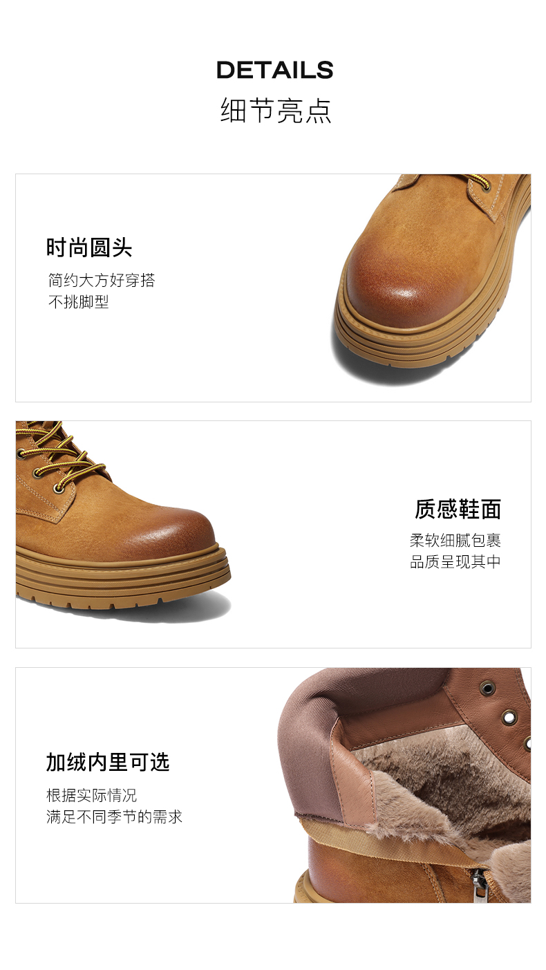 | 制鞋工艺:胶贴皮鞋 | 款式季节:冬季 | 鞋垫材质:人造短毛绒 | 鞋类流行款式:工装靴 |