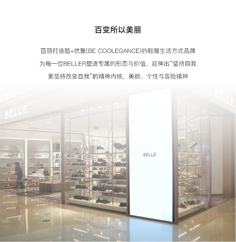 BeLLE(百丽),百变所以美丽。主张多变多元的新生代态度,不断融合潮流趋势,拥抱不同的生活体验与生活经历。将女性的百变魅力注入到鞋履设计中,让女人在不同的人生阶段,不同的场合,不同的潮流趋势下,尽显自己自信的一面。致力于为现代都市女性提供充满自由的行走体验。