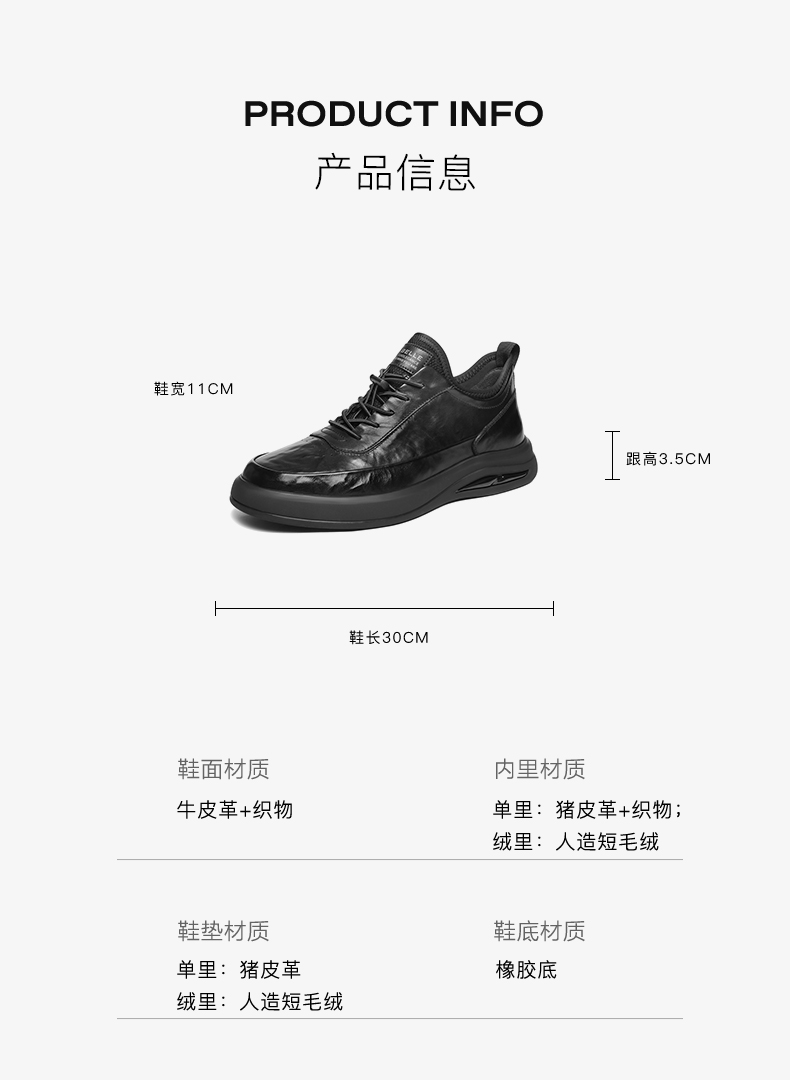 | 风格:休闲 | 色系:黑色 | 跟高数值:3.5CM | 40码鞋宽参考(男):11CM | 性别:男子 |