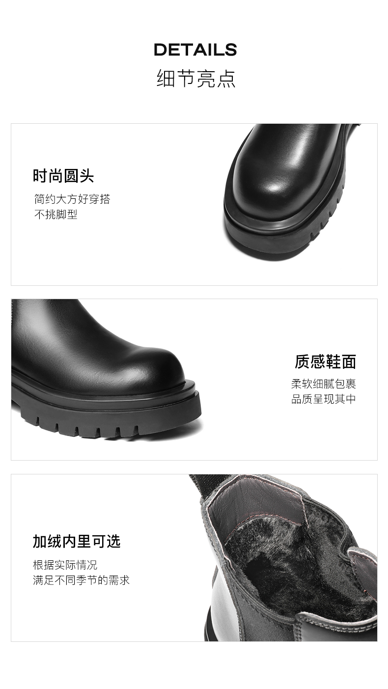 | 制鞋工艺:胶贴皮鞋 | 款式季节:冬季 | 鞋垫材质:猪皮革 | 鞋类流行款式:切尔西靴 |