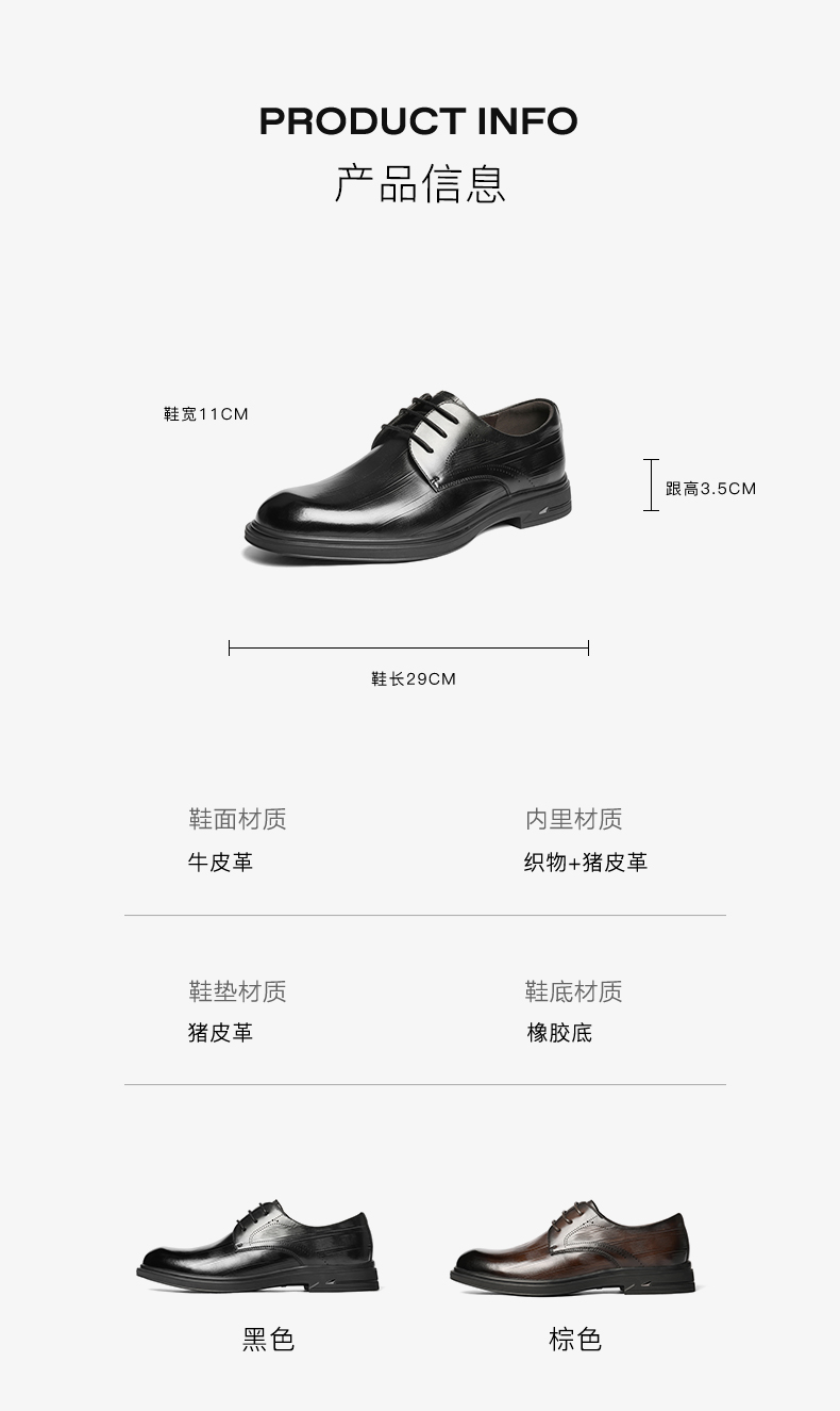| 风格:商务 | 色系:棕色 | 跟高数值:3.5CM | 40码鞋宽参考(男):11CM | 性别:男子 |