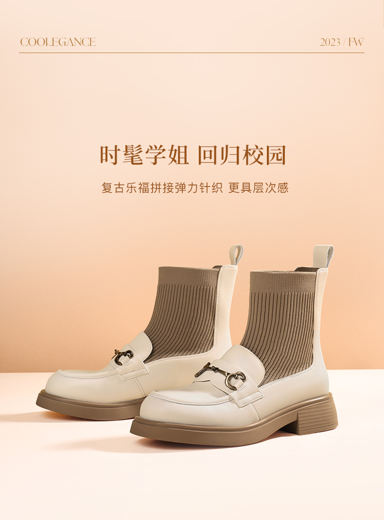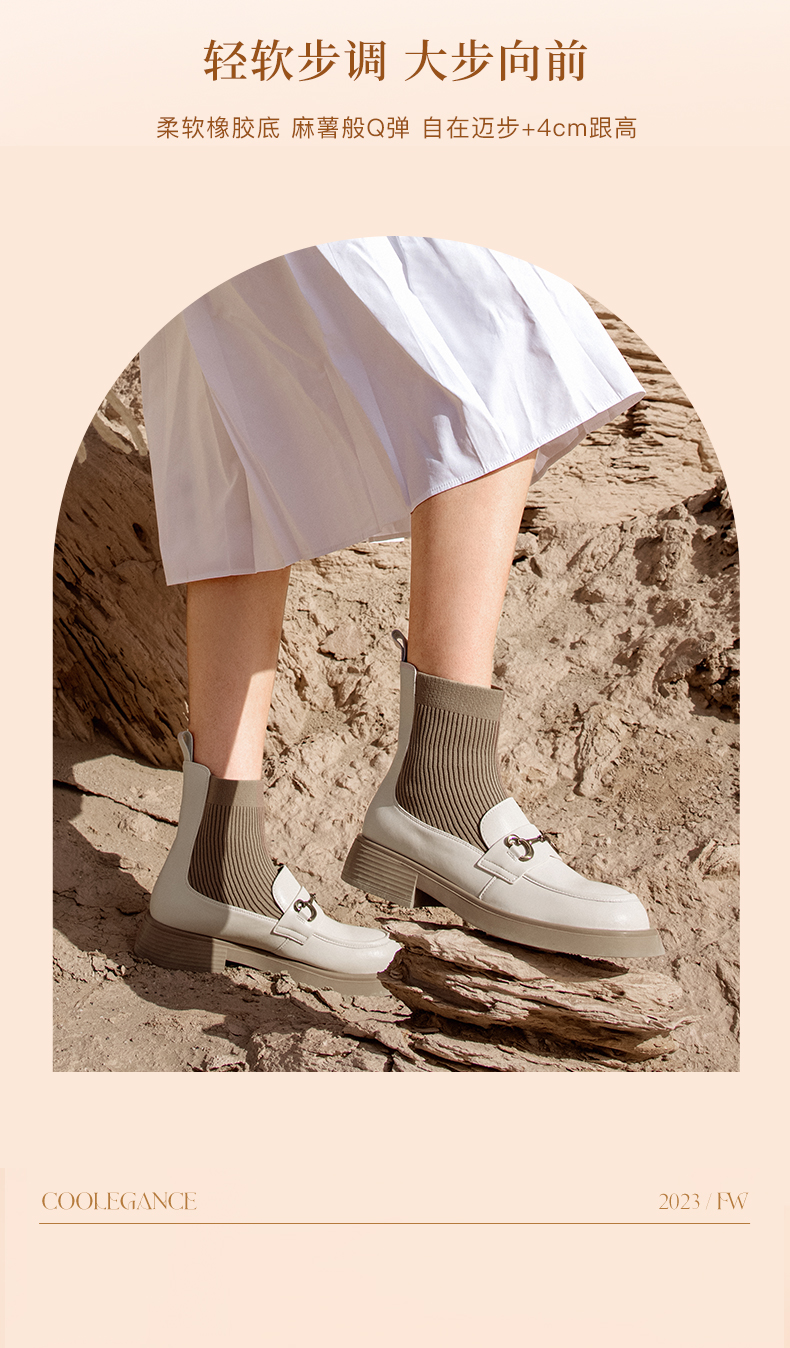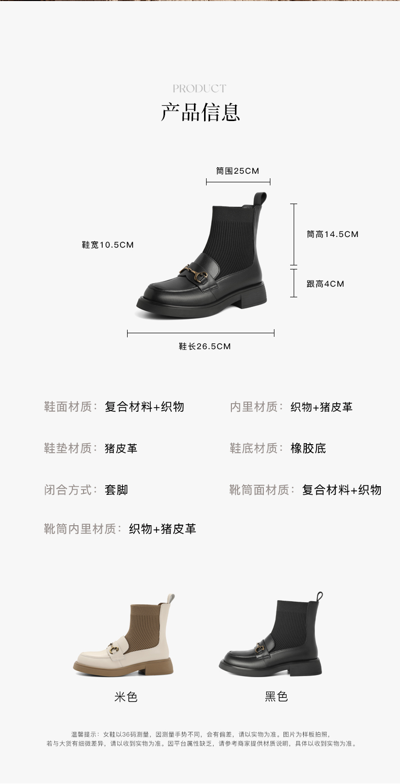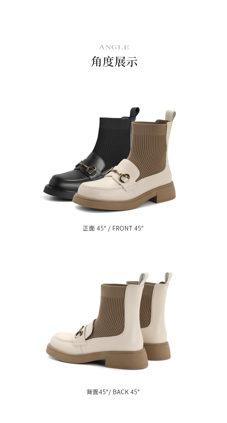 | 鞋类流行款式:袜靴 | 鞋头款式:圆头 | 执行标准:舒适上班鞋Q/LR001-2023 若与实物产生差异,请以实物标签为准 | 跟高范围:中跟鞋(3-5CM) | 鞋面图案:纯色 |