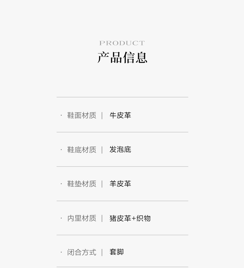 | 制鞋工艺:车线胶粘 | 款式季节:秋季 | 鞋垫材质:羊皮革 | 渠道划分:线下同步 | 前掌高度:无 |