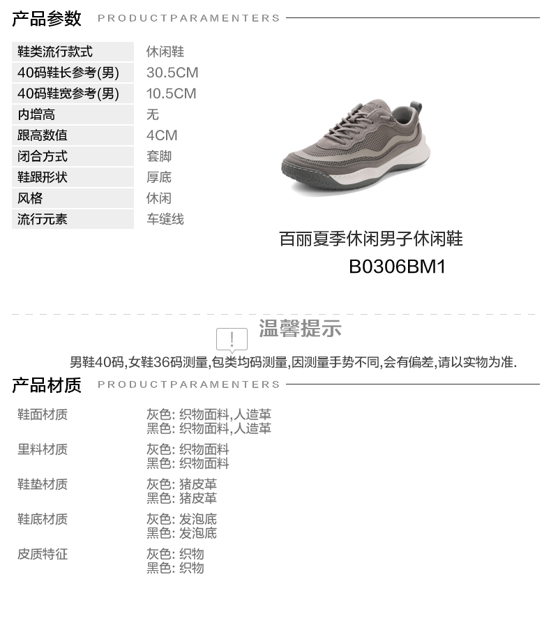 | 色系:灰色 | 跟高数值:4CM | 货品来源:外购 | 40码鞋宽参考(男):10.5CM | 性别:男子 |