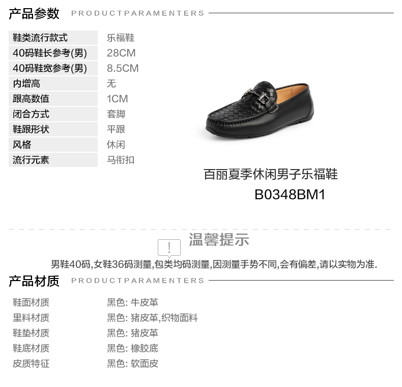 | 色系:黑色 | 跟高数值:1CM | 货品来源:外购 | 40码鞋宽参考(男):8.5CM | 性别:男子 |