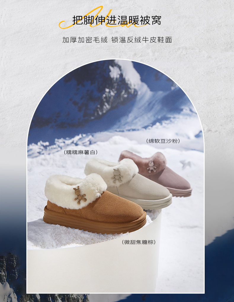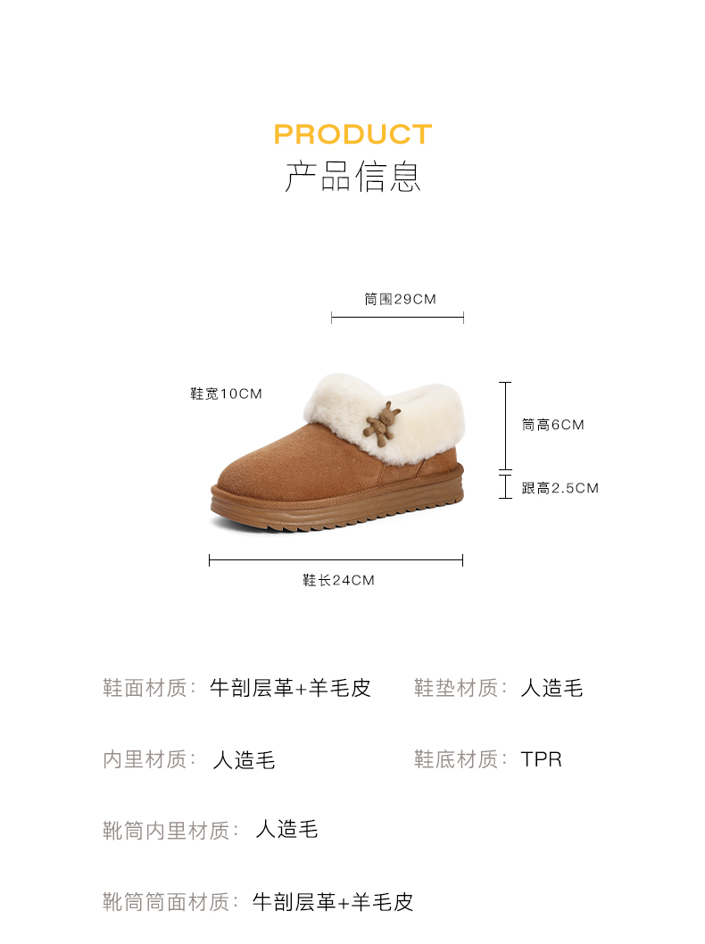 | 里料材质:人造毛绒羊毛 | 上市时间:2022年冬季 | 制鞋工艺:车线胶粘 | 款式季节:冬季 | 鞋垫材质:人造长毛绒 |