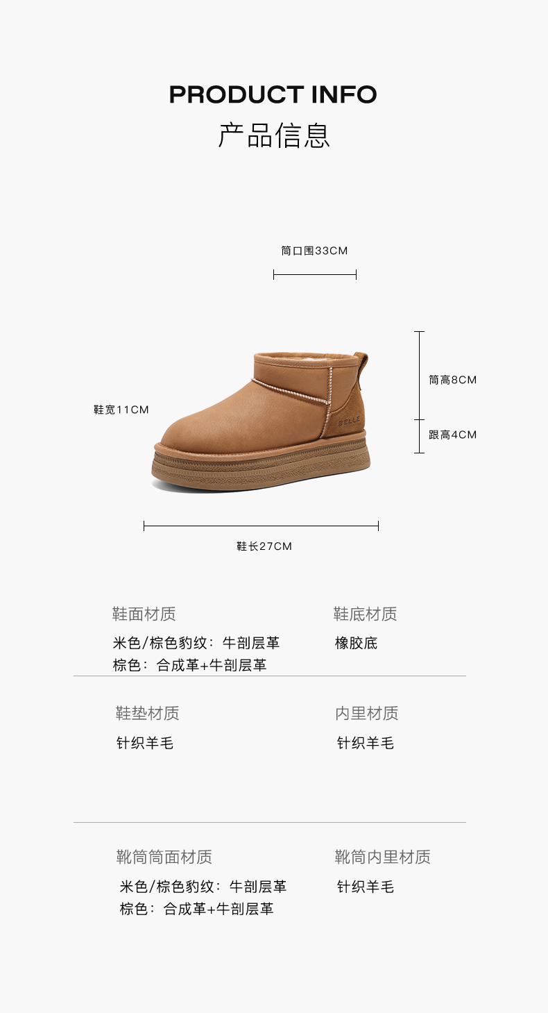 | 帮面材质:牛剖层革 | 配跟:无 | 靴筒口围:33CM | 上市时间:2024年冬季 | 鞋类流行款式:雪地靴 |
