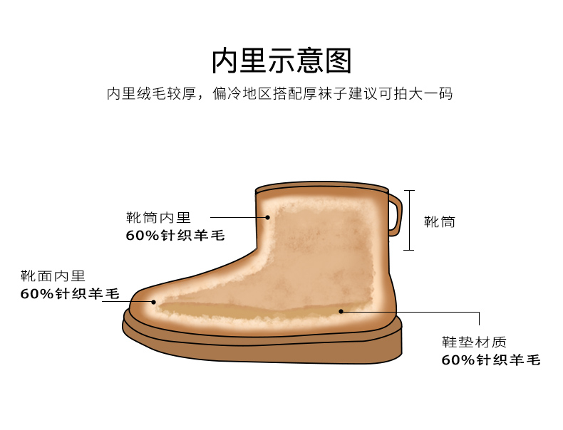 | 性别:女子 | 靴筒筒面材质:牛剖层革 | 里料材质:针织羊毛 | 制鞋工艺:车线胶粘 | 鞋垫材质:针织羊毛 |