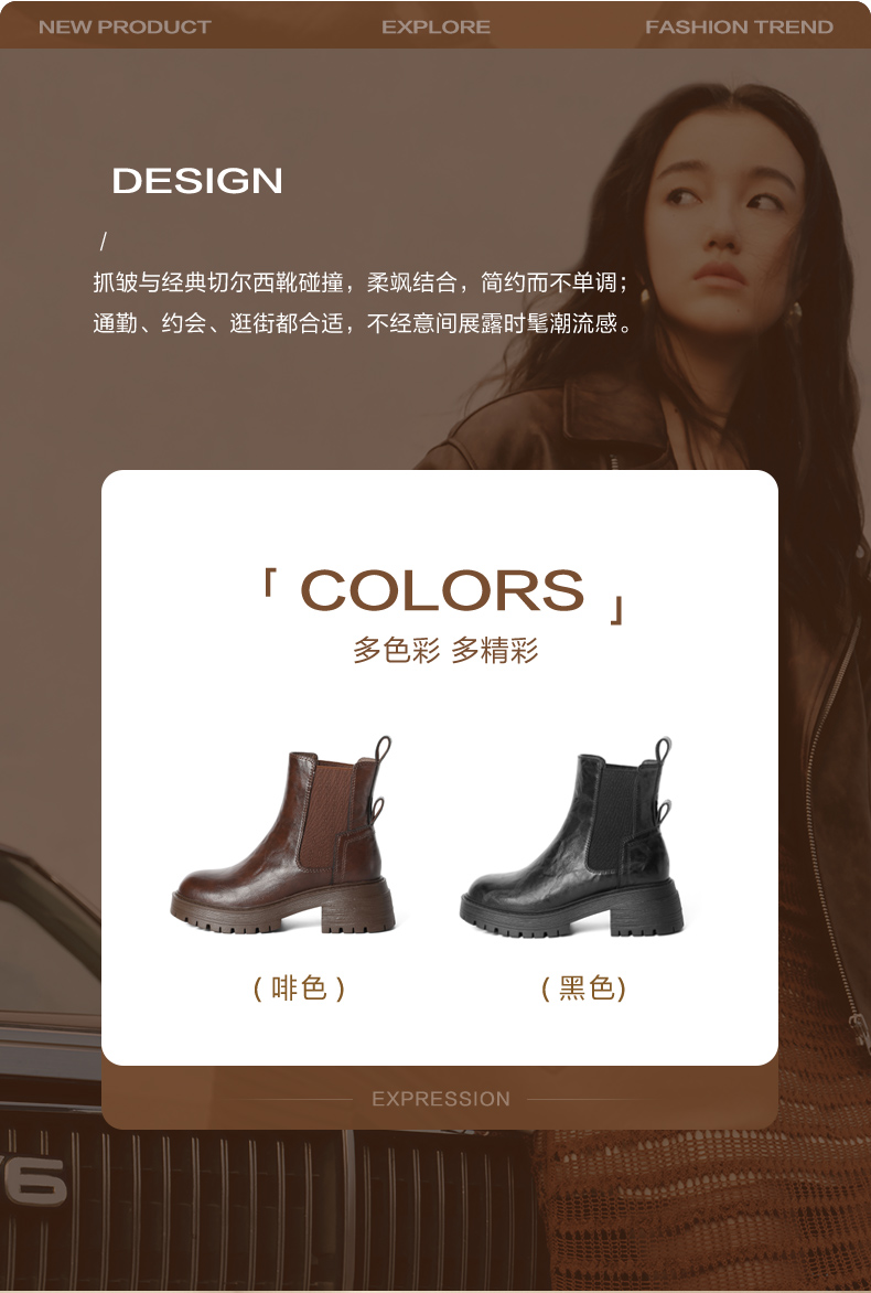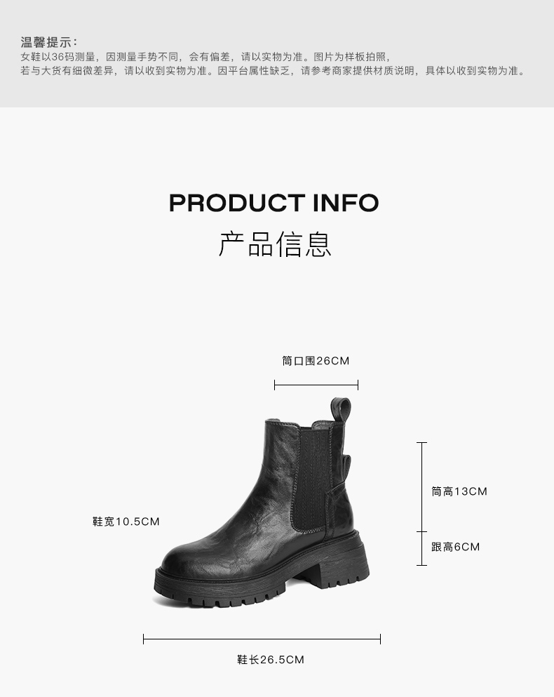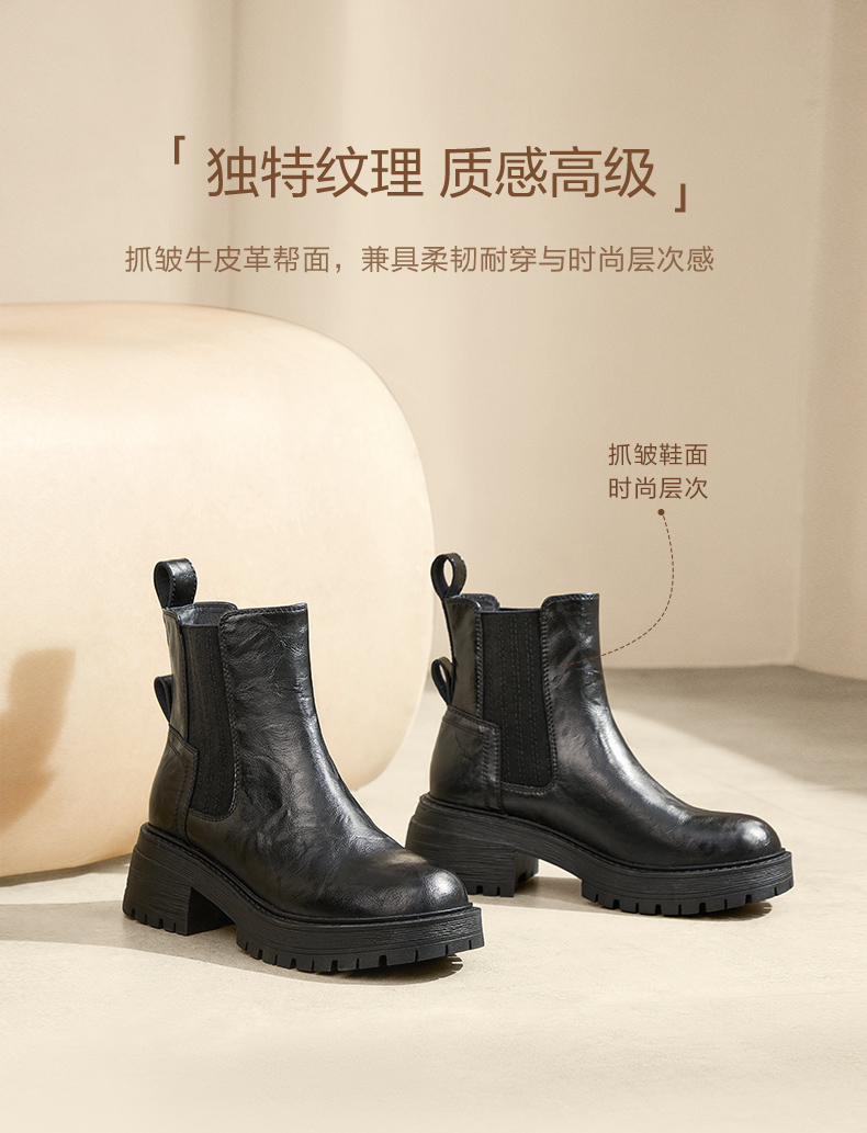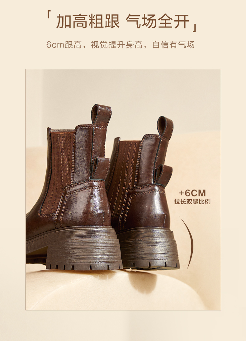 | 鞋类流行款式:切尔西靴 | 鞋头款式:圆头 | 执行标准:舒适上班鞋Q/LR001-2023若与实物产生差异,请以实物标签为准 | 跟高范围:高跟鞋(6-8CM) | 鞋面图案:纯色 |