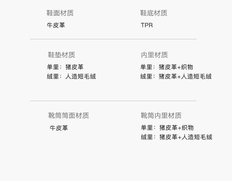 | 功能科技:耐磨 | 鞋底材质:TPR大底 | 靴筒内里材质:猪皮革人造短毛绒 | 内增高:无 | 鞋面材质:牛皮革 |
