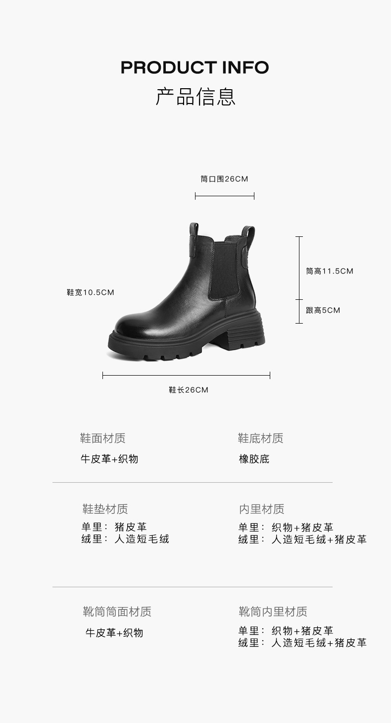 | 鞋类流行款式:切尔西靴 | 鞋头款式:圆头 | 执行标准:舒适上班鞋Q/LR001-2023若与实物产生差异,请以实物标签为准 | 跟高范围:中跟鞋(3-5CM) | 鞋面图案:纯色 |