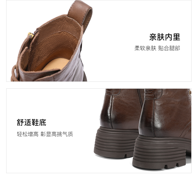 | 筒高数值:13CM | 性别:女子 | 靴筒筒面材质:牛皮革 | 里料材质:猪皮革织物面料 | 制鞋工艺:车线胶粘 |