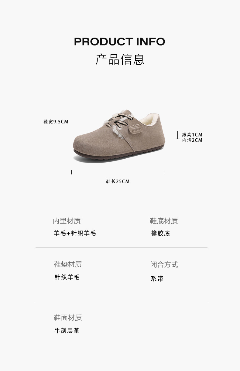 | 制鞋工艺:车线胶粘 | 款式季节:冬季 | 鞋垫材质:针织羊毛 | 渠道划分:电商专销 | 前掌高度:无 |