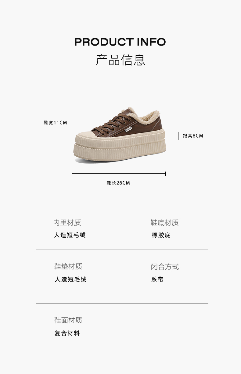 | 制鞋工艺:车线胶粘 | 款式季节:春季 | 鞋垫材质:人造短毛绒 | 渠道划分:电商专销 | 前掌高度:无 |