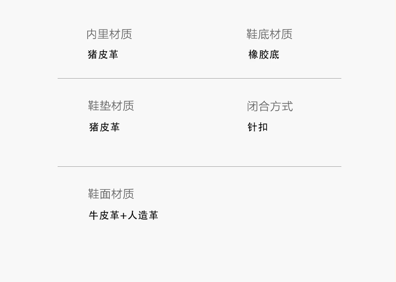 | 款式季节:春季 | 鞋垫材质:猪皮革 | 渠道划分:电商专销 | 前掌高度:无 | 皮质特征:无 |