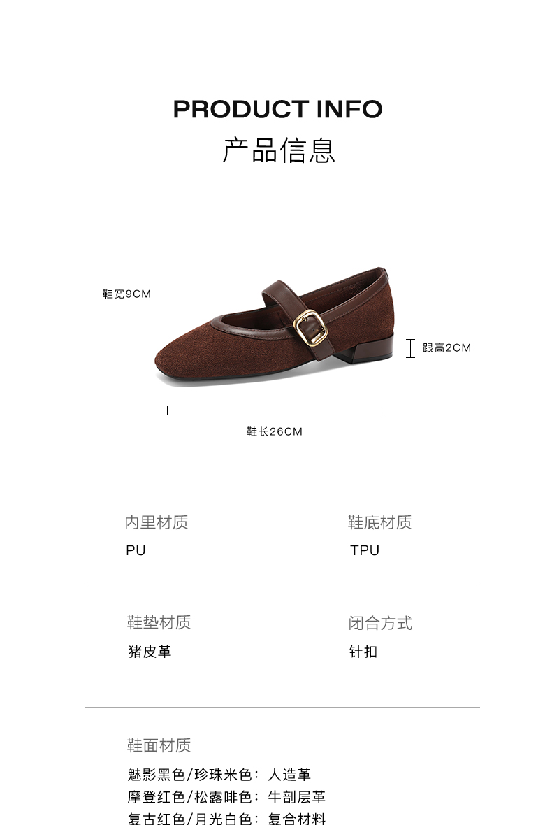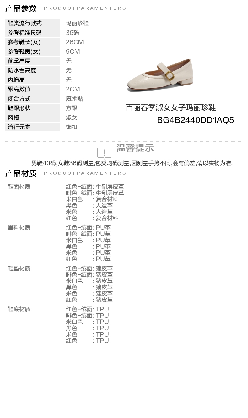 | 上市时间:2025年春季 | 生产/经销/进口厂家:百丽电子商务(上海)有限公司 | 鞋类流行款式:玛丽珍鞋 | 鞋头款式:方头 | 执行标准:舒适上班鞋Q/LR001-2023若与实物发生差异,请以实物标签为准 |