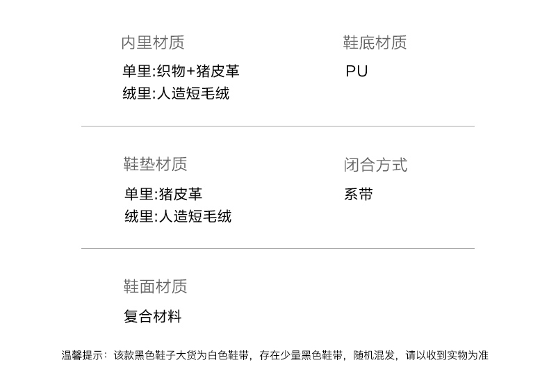 | 制鞋工艺:车线胶粘 | 款式季节:春季 | 鞋垫材质:人造短毛绒 | 渠道划分:电商专销 | 前掌高度:无 |