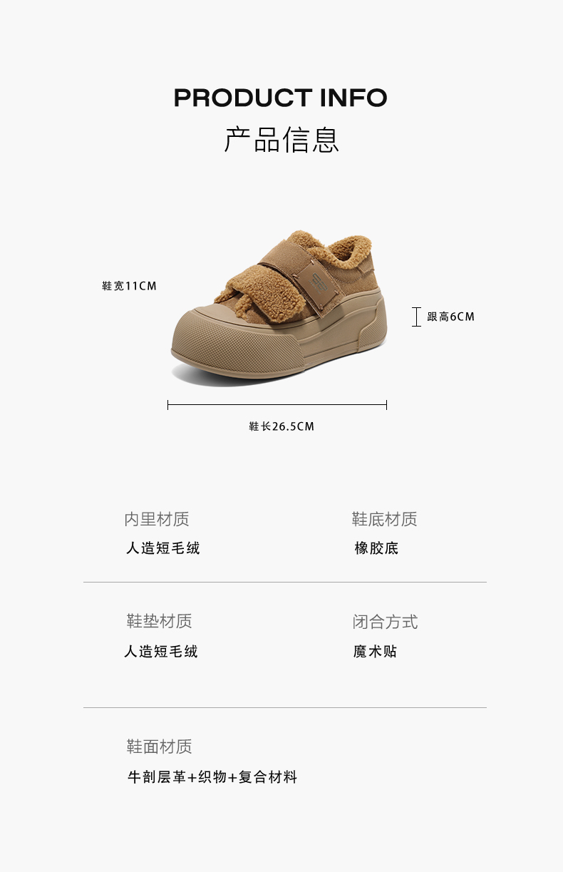 | 制鞋工艺:车线胶粘 | 款式季节:春季 | 鞋垫材质:人造短毛绒 | 渠道划分:电商专销 | 前掌高度:无 |