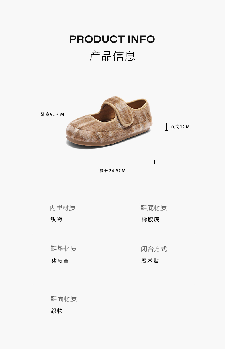 | 色系:棕色 | 跟高数值:1CM | 性别:女子 | 里料材质:织物 | 制鞋工艺:车线胶粘 |