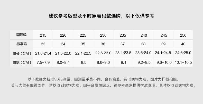 | 参考鞋长(女):25CM | 流行元素:撞色 | 参考鞋宽(女):8.5CM | 风格:休闲 | 鞋面内里材质:织物 |