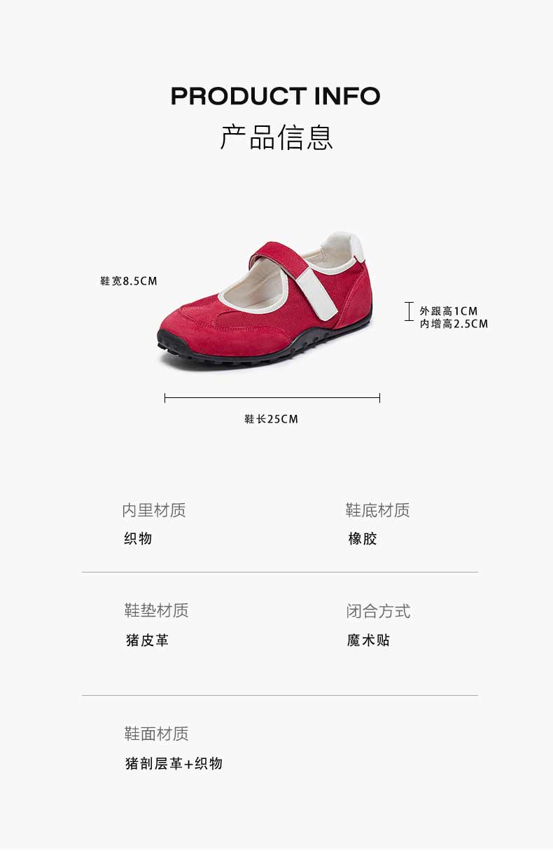 | 鞋底材质:橡胶底 | 内增高:2.5CM | 鞋面材质:织物猪剖层革 | 闭合方式:魔术贴 | 配跟:无 |