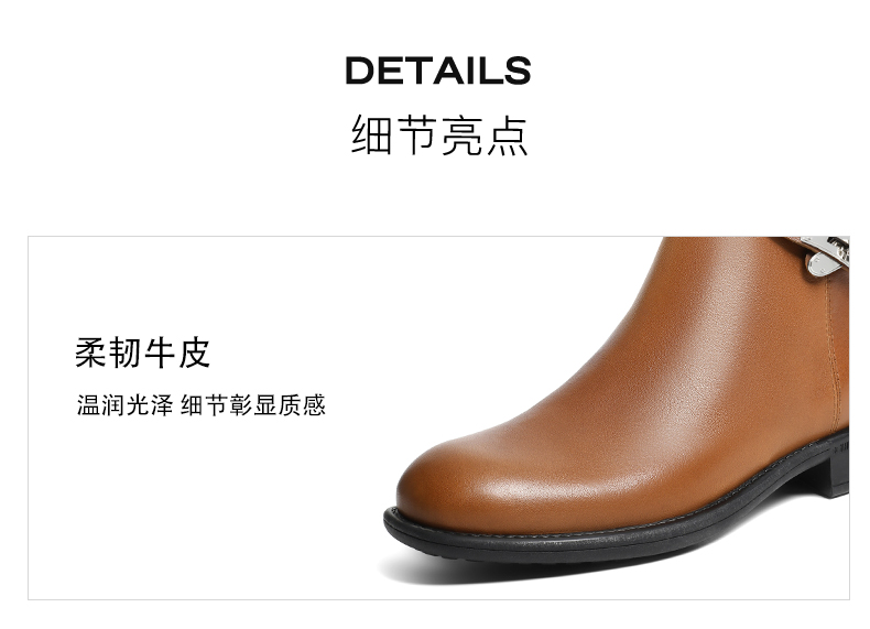 | 筒高数值:15CM | 性别:女子 | 靴筒筒面材质:牛皮革 | 里料材质:猪皮革织物 | 制鞋工艺:车线胶粘 |