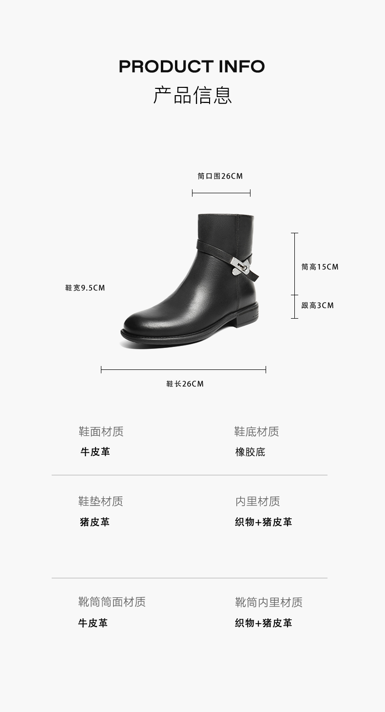 | 筒高数值:15CM | 性别:女子 | 靴筒筒面材质:牛皮革 | 里料材质:猪皮革织物 | 制鞋工艺:车线胶粘 |