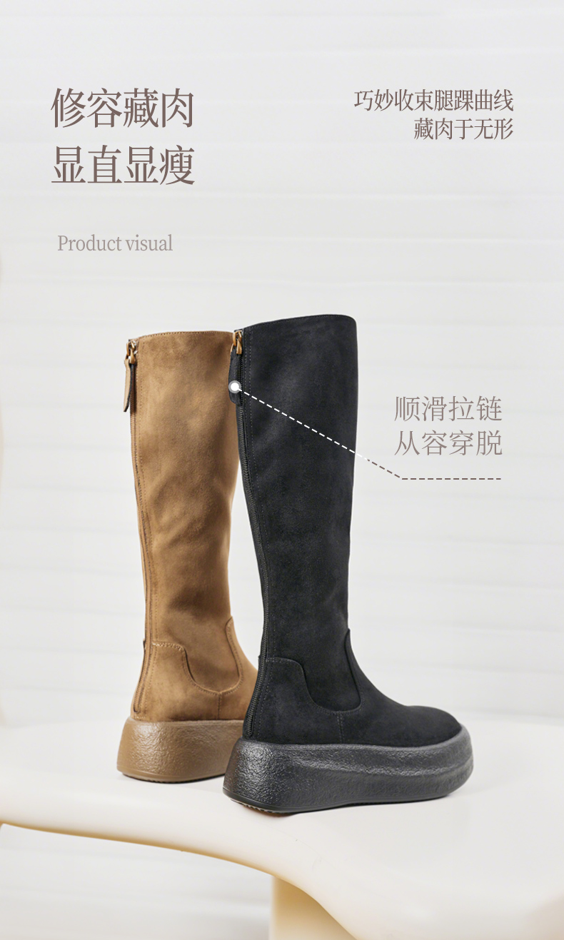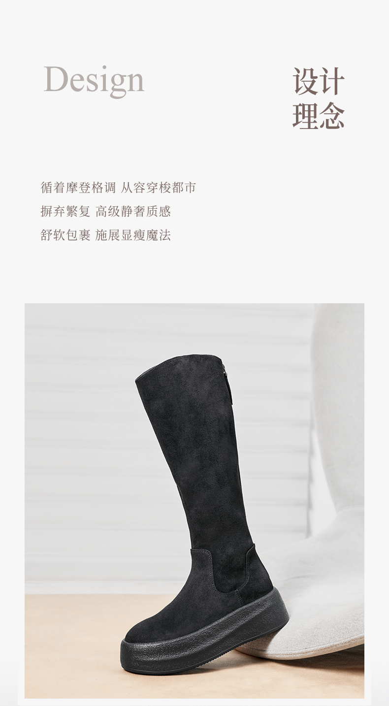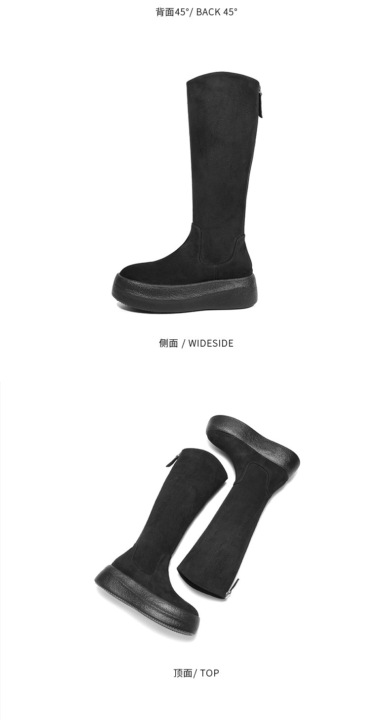 | 风格:休闲 | 鞋面内里材质:织物 | 色系:黑色 | 跟高数值:5CM | 筒高数值:24CM |