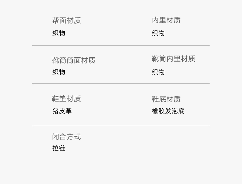 | 鞋底材质:橡胶发泡底 | 靴筒内里材质:织物 | 内增高:无 | 鞋面材质:织物 | 闭合方式:后拉链 |