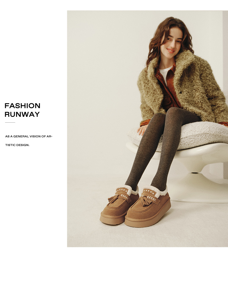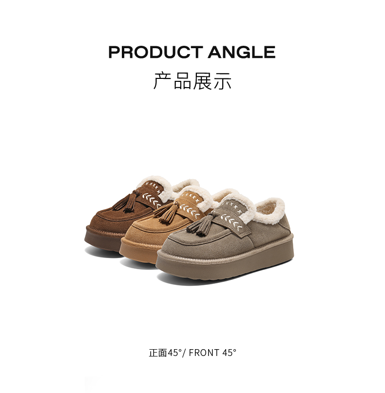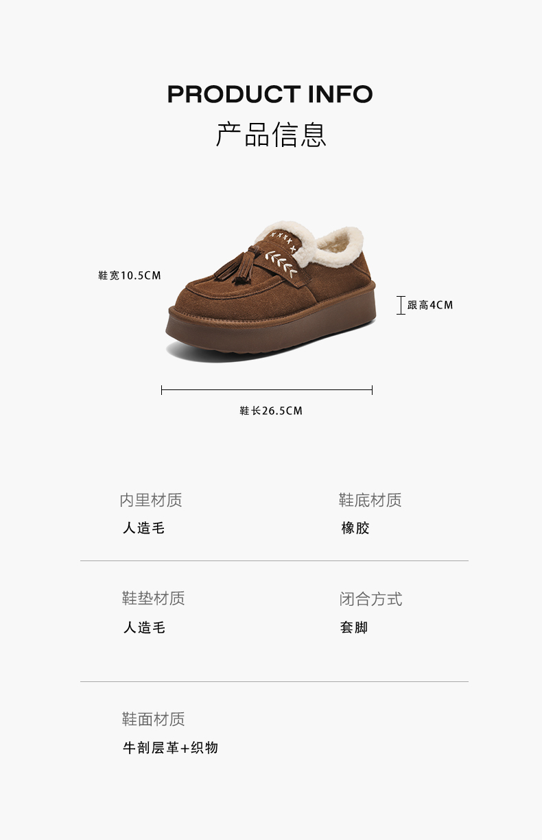 | 风格:休闲 | 鞋面内里材质:人造毛绒 | 色系:咖啡色 | 跟高数值:4CM | 适用人群:通用 |