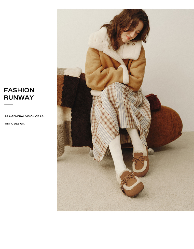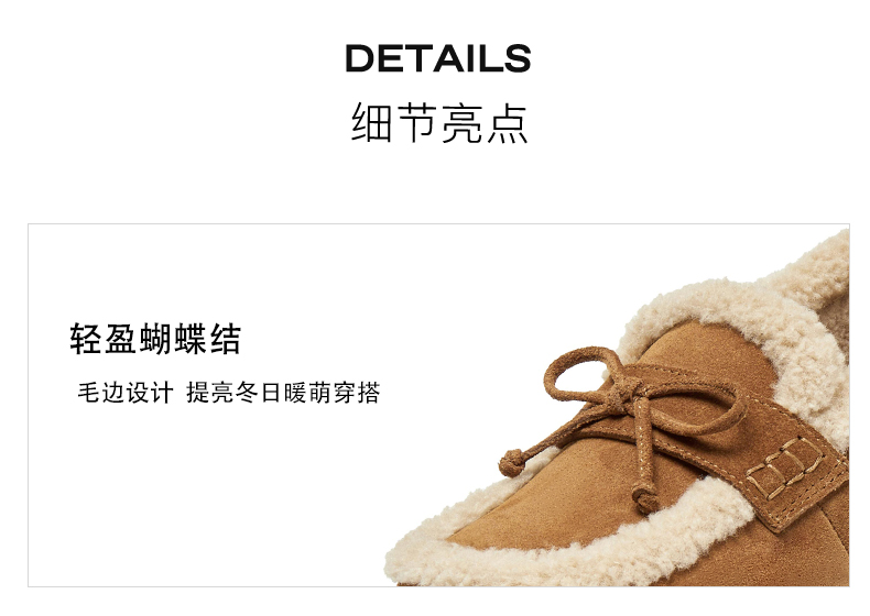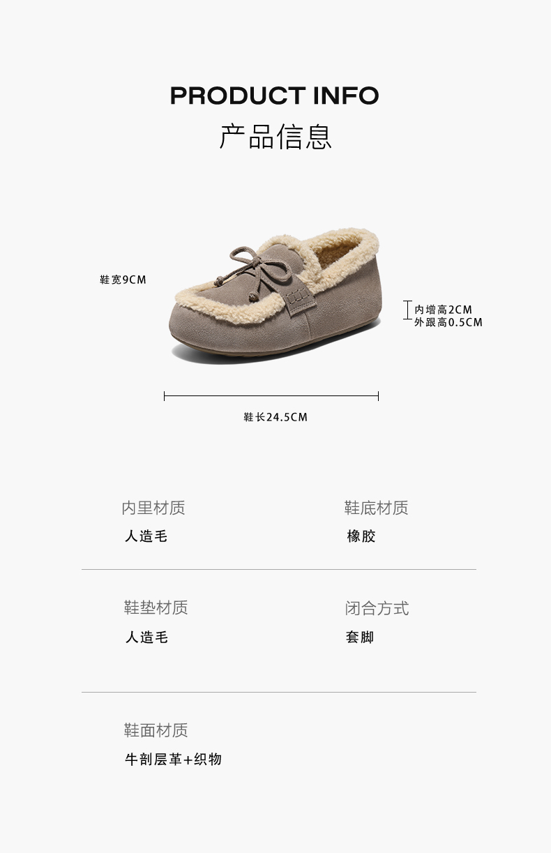 | 风格:休闲 | 鞋面内里材质:人造毛绒 | 色系:棕色 | 跟高数值:0.5CM | 适用人群:通用 |