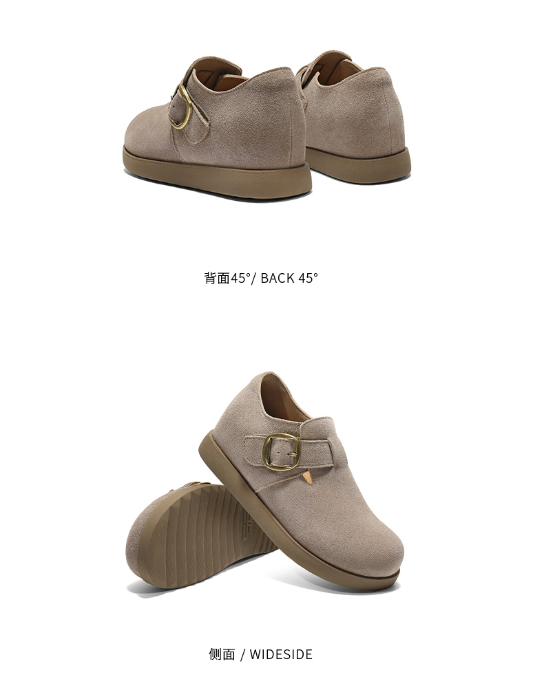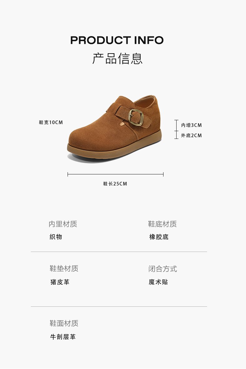 | 鞋帮:低帮 | 鞋底材质:橡胶底 | 内增高:3CM | 鞋面材质:牛剖层革 | 闭合方式:针扣 |