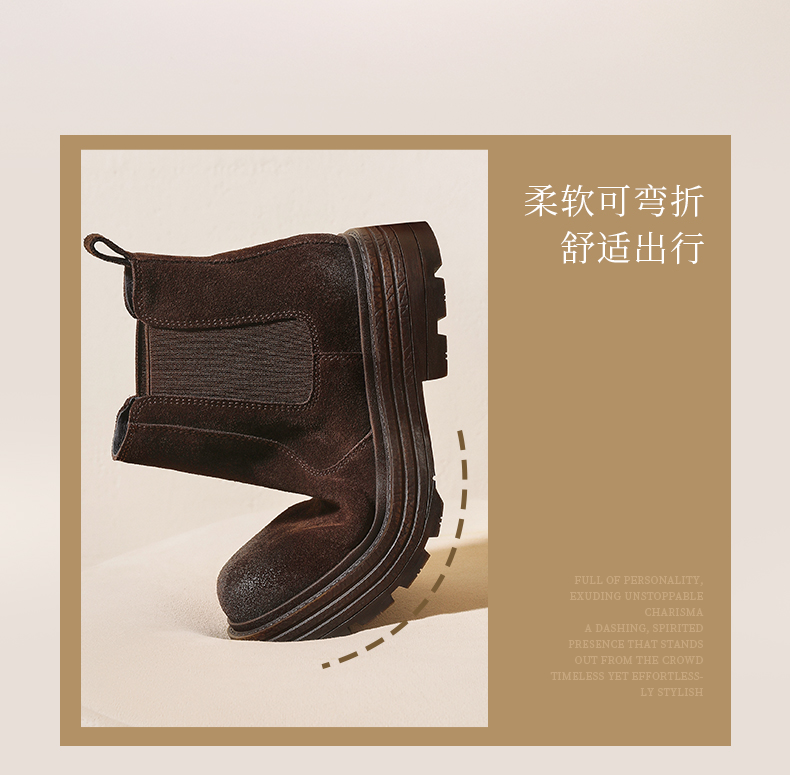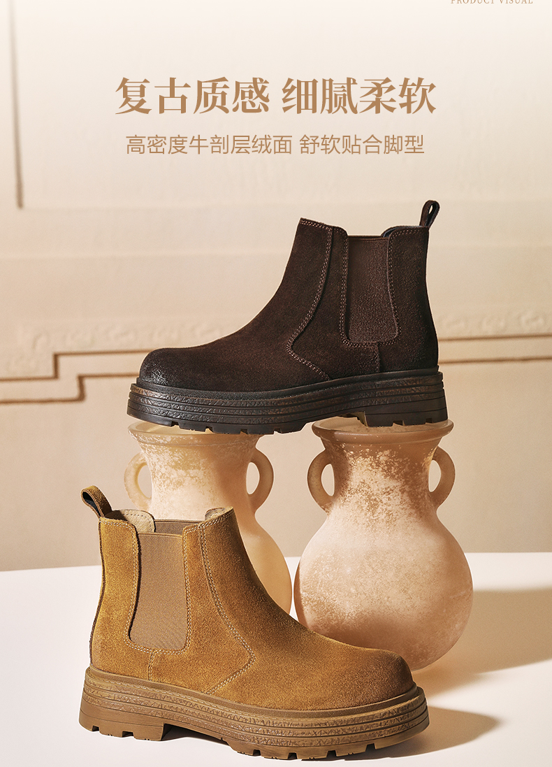 | 帮面材质:织物牛剖层革 | 配跟:无 | 靴筒口围:27CM | 上市时间:2025年冬季 | 鞋类流行款式:切尔西靴 |