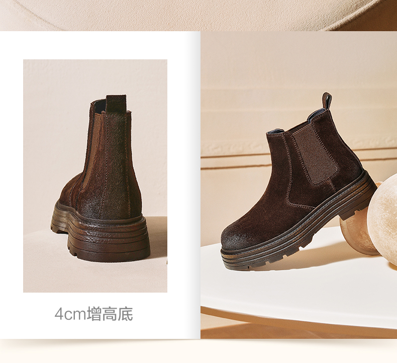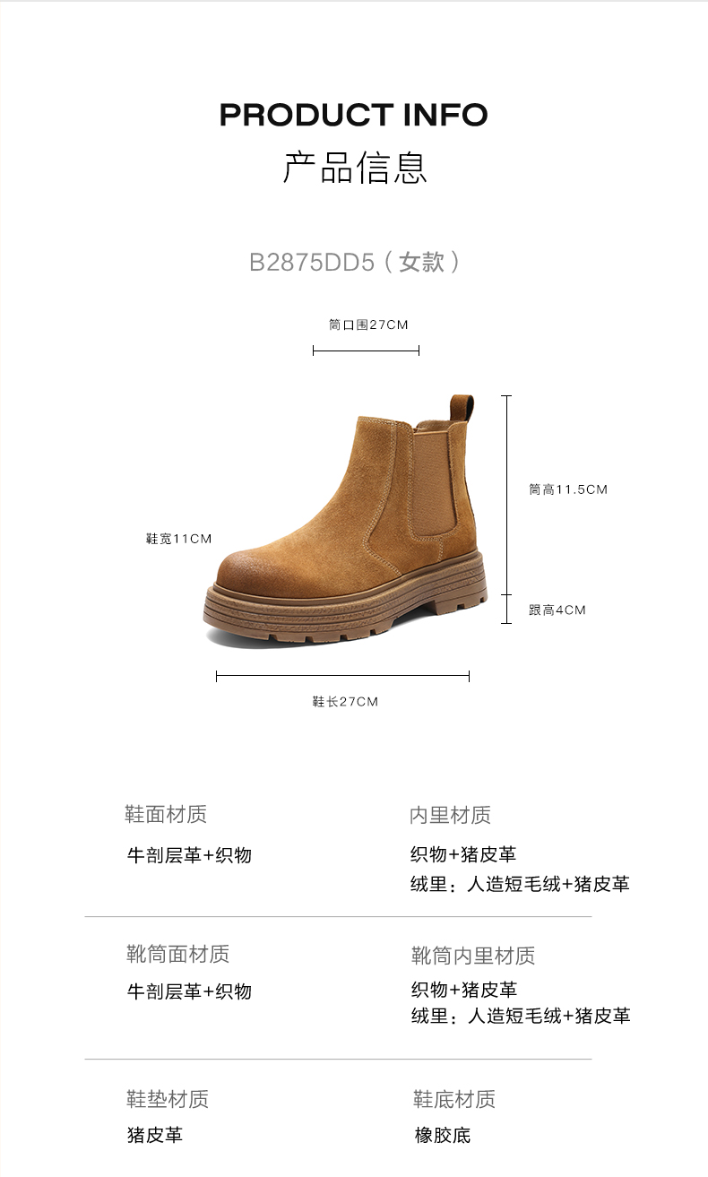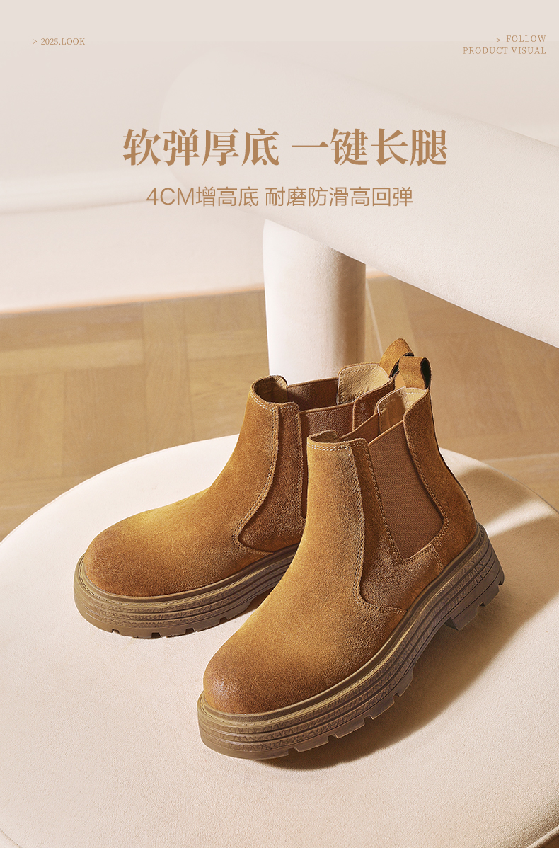 | 帮面材质:织物牛剖层革 | 配跟:无 | 靴筒口围:27CM | 上市时间:2025年冬季 | 鞋类流行款式:切尔西靴 |
