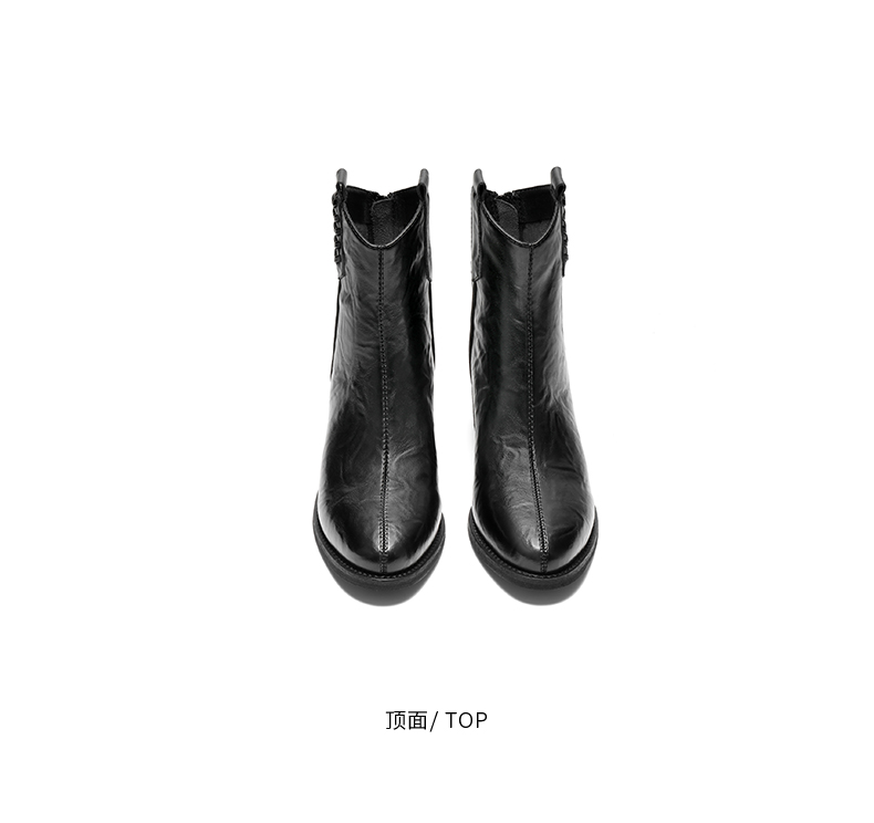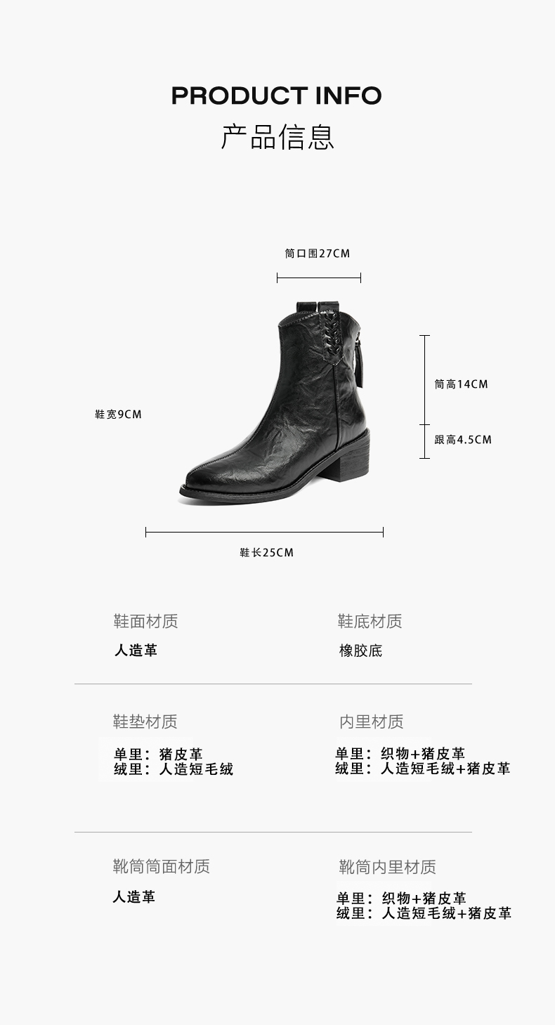 | 筒高数值:14CM | 性别:女子 | 靴筒筒面材质:人造革 | 里料材质:猪皮革人造短毛绒 | 制鞋工艺:车线胶粘 |