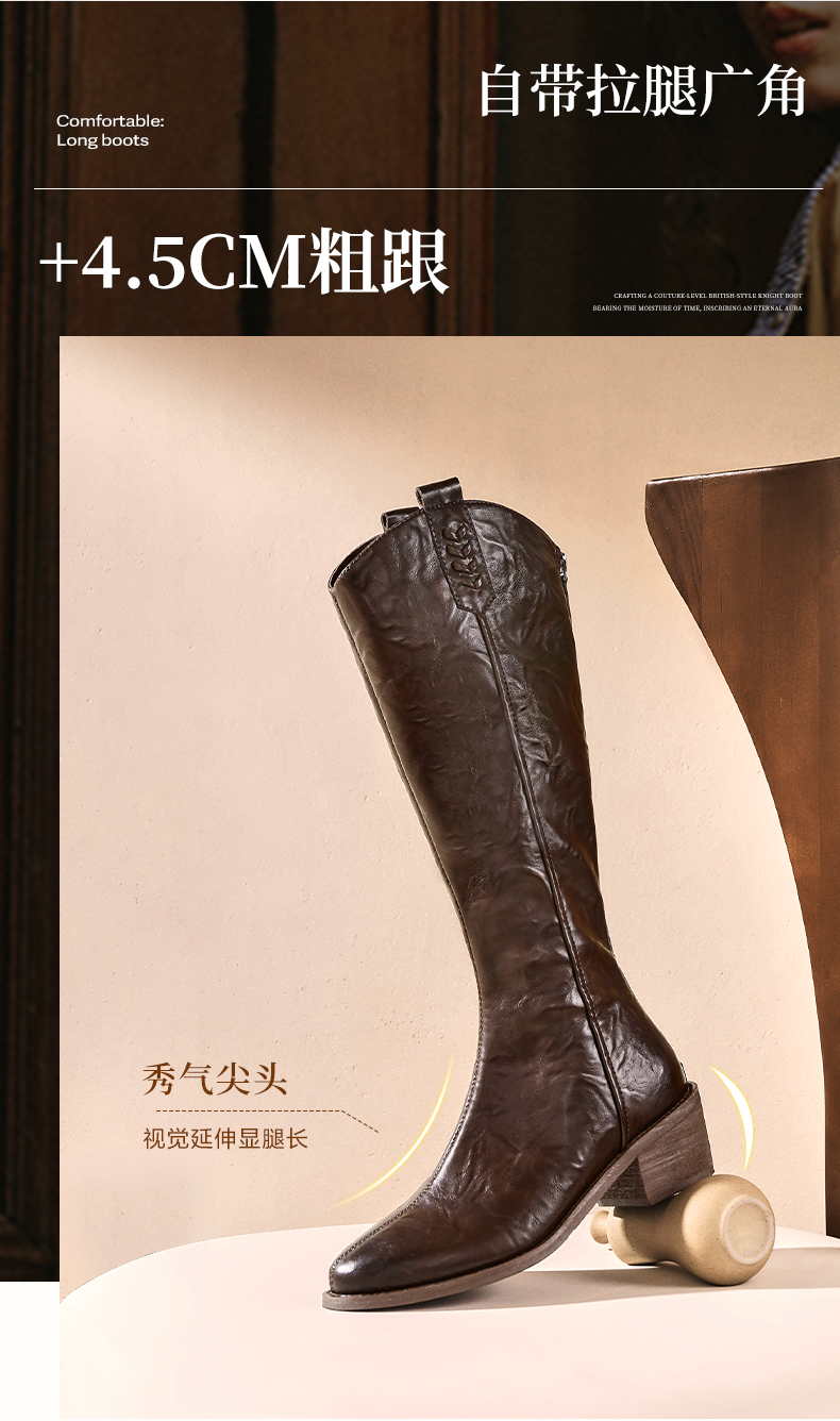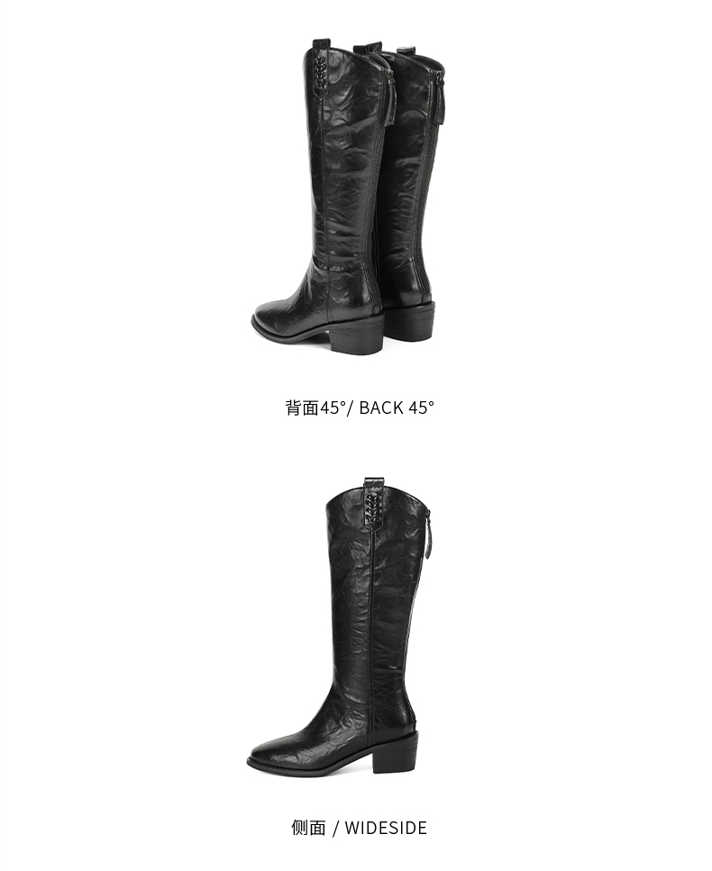 | 风格:简约 | 鞋面内里材质:猪皮革织物 | 色系:黑色 | 跟高数值:4.5CM | 筒高数值:35CM |