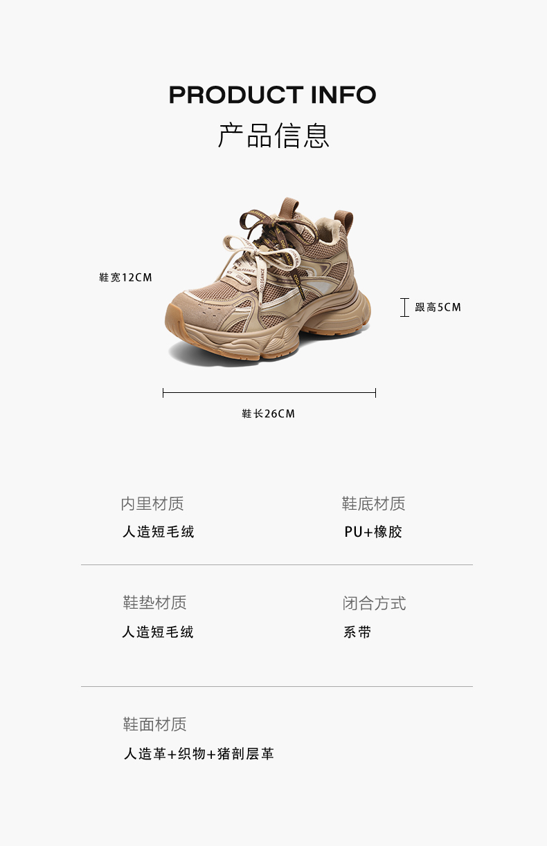 | 闭合方式:系带 | 配跟:无 | 上市时间:2025年冬季 | 鞋类流行款式:老爹鞋 | 鞋头款式:圆头 |