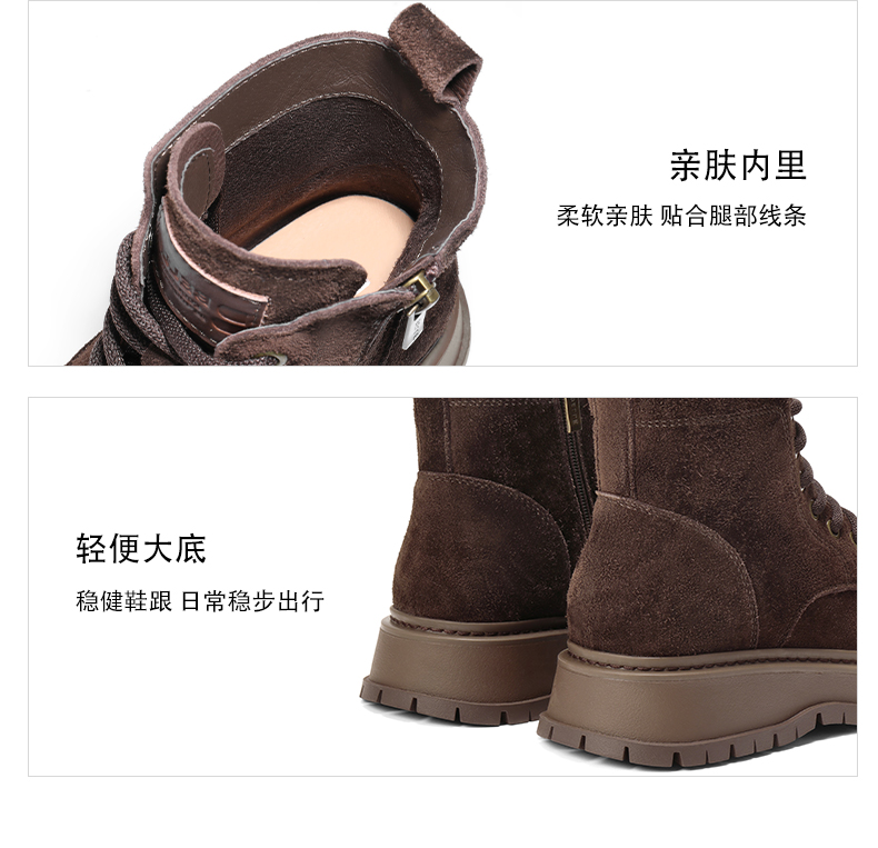 | 鞋底材质:TPR | 靴筒内里材质:猪皮革织物 | 内增高:无 | 鞋面材质:牛皮革 | 闭合方式:系带 |
