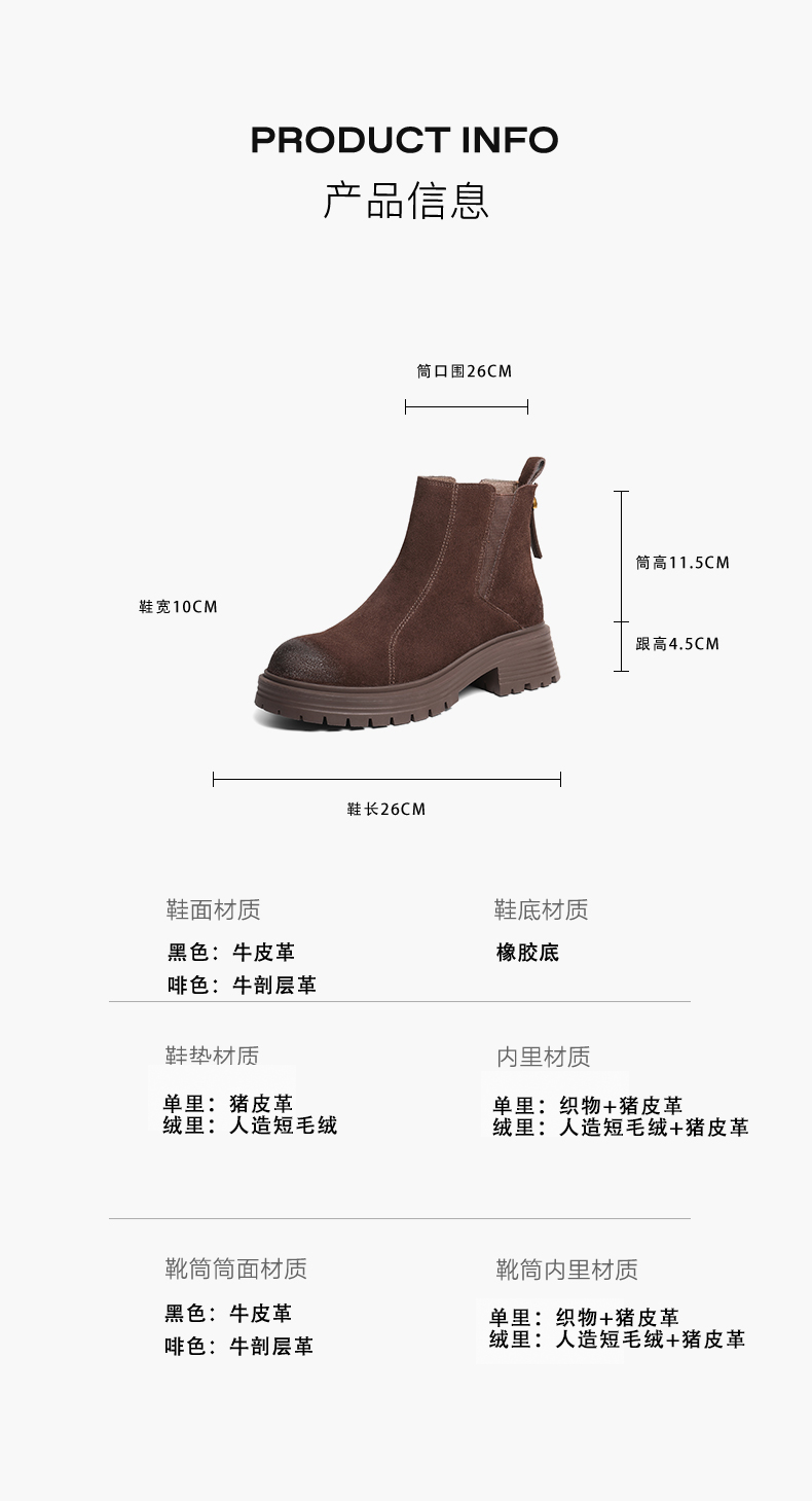 | 帮面材质:织物牛皮革 | 配跟:无 | 靴筒口围:26CM | 上市时间:2025年冬季 | 鞋类流行款式:切尔西靴 |