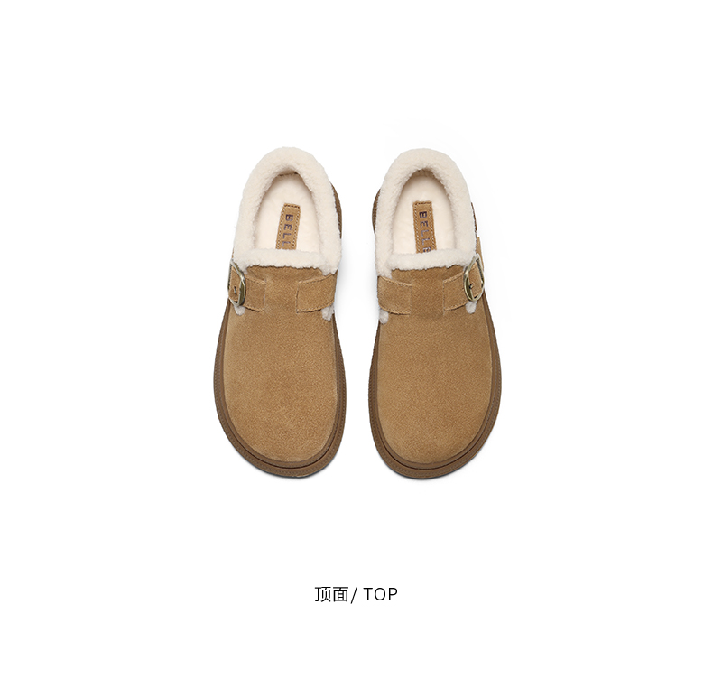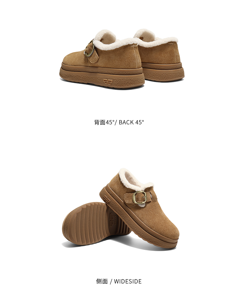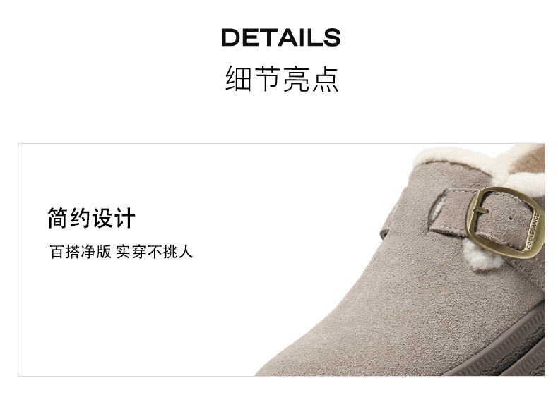 | 筒高数值:无 | 性别:女子 | 靴筒筒面材质:牛剖层革 | 里料材质:人造短毛绒 | 制鞋工艺:车线胶粘 |