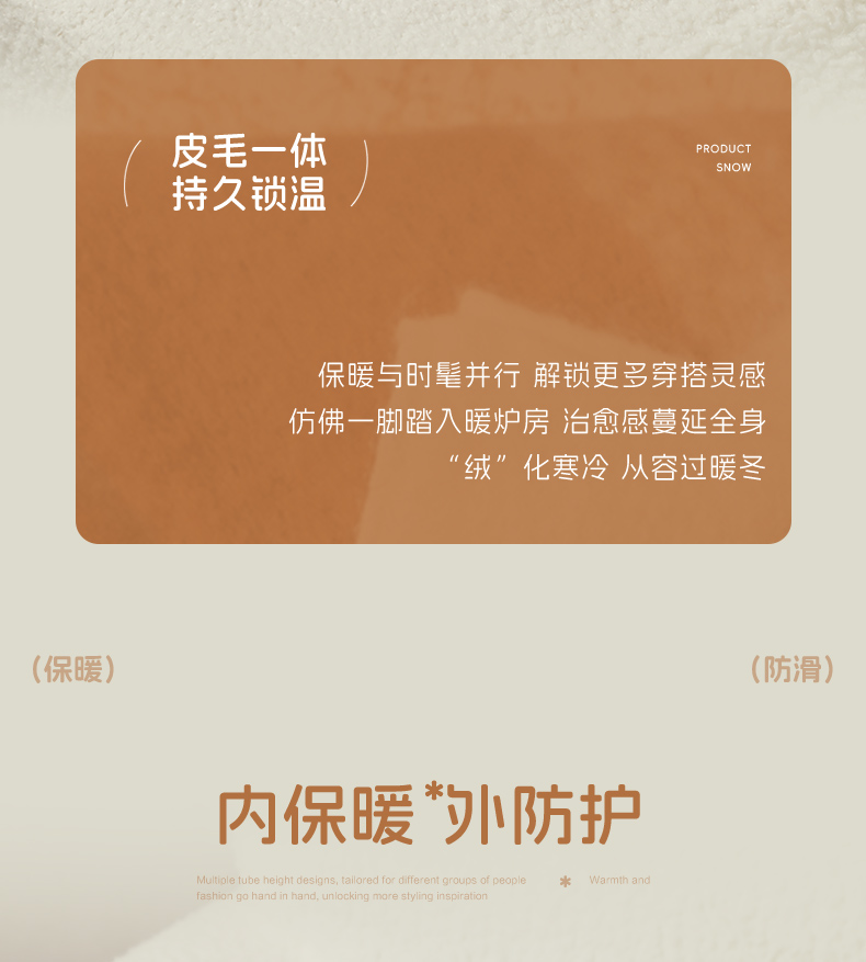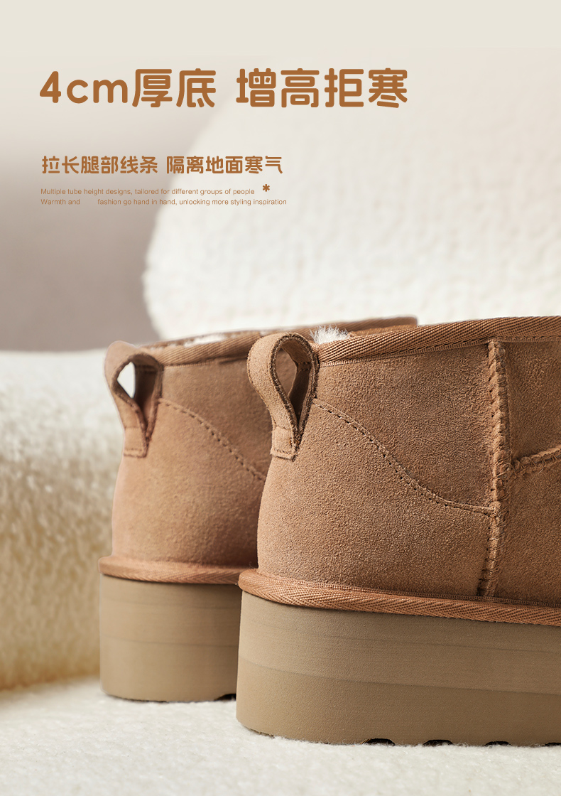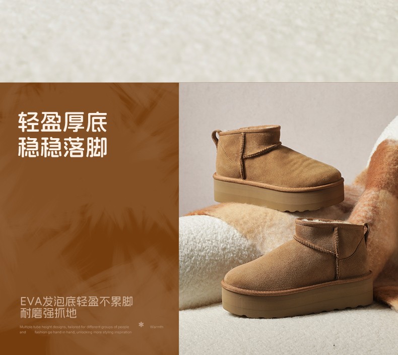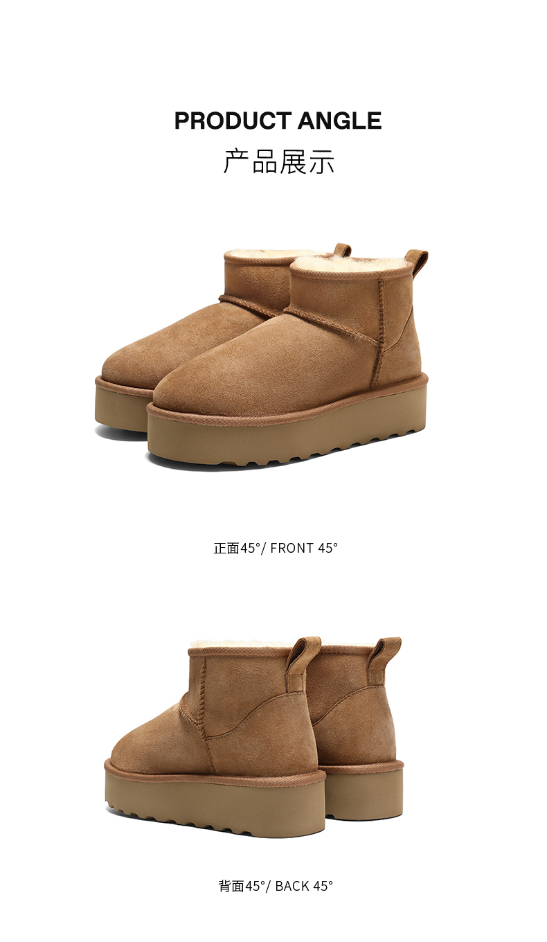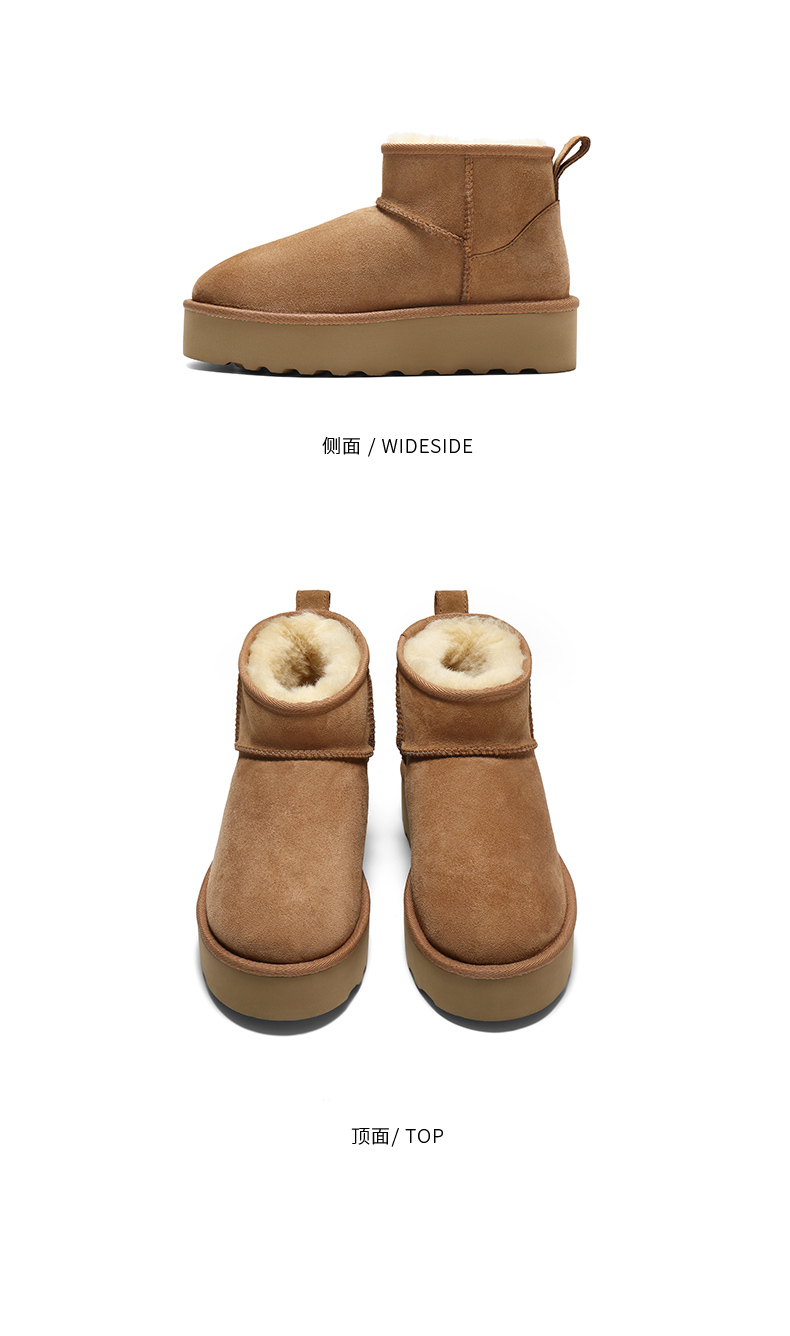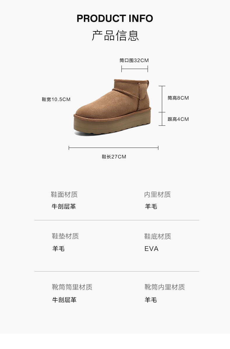 | 帮面材质:牛剖层革羊毛革 | 配跟:无 | 靴筒口围:32CM | 上市时间:2025年冬季 | 鞋类流行款式:雪地靴 |